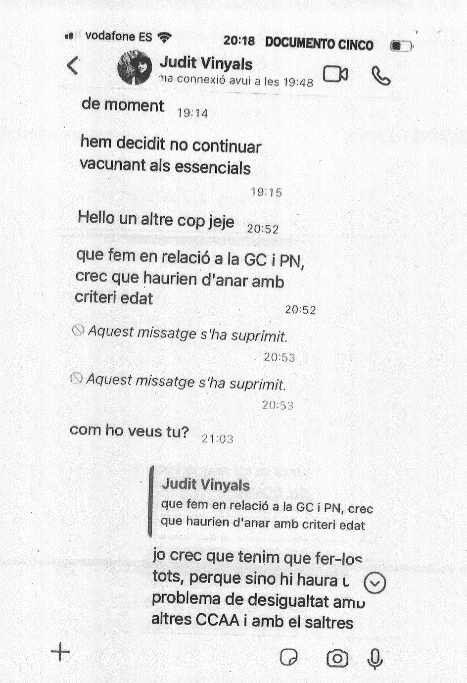 No fue una vez, sino varias. Porque hubo insistencia por parte de la Generalidad catalana en la exigencia de atrasar las vacunas contra el covid destinadas a la Guardia Civil y la Policía Nacional. Los WhatsApp que reproduce LD son las pruebas aportadas judicialmente que indican que fue la entonces consejera de Sanidad, Alba Vergés (ERC) la que reclamó retrasar la vacunación de los agentes sin aportar "argumentación", como señalan expresamente los mensajes de unos de los miembros de su gabinete.