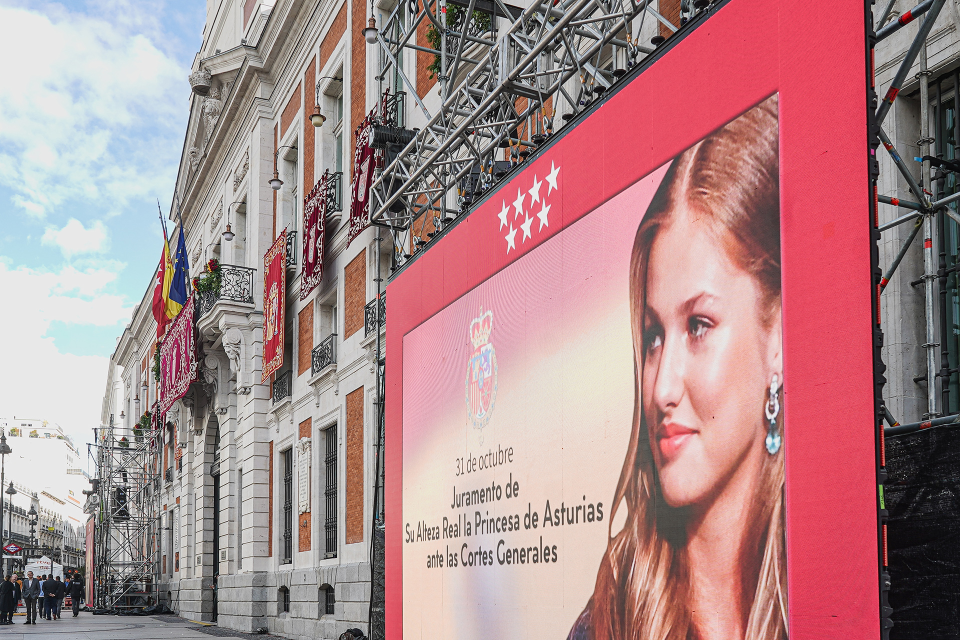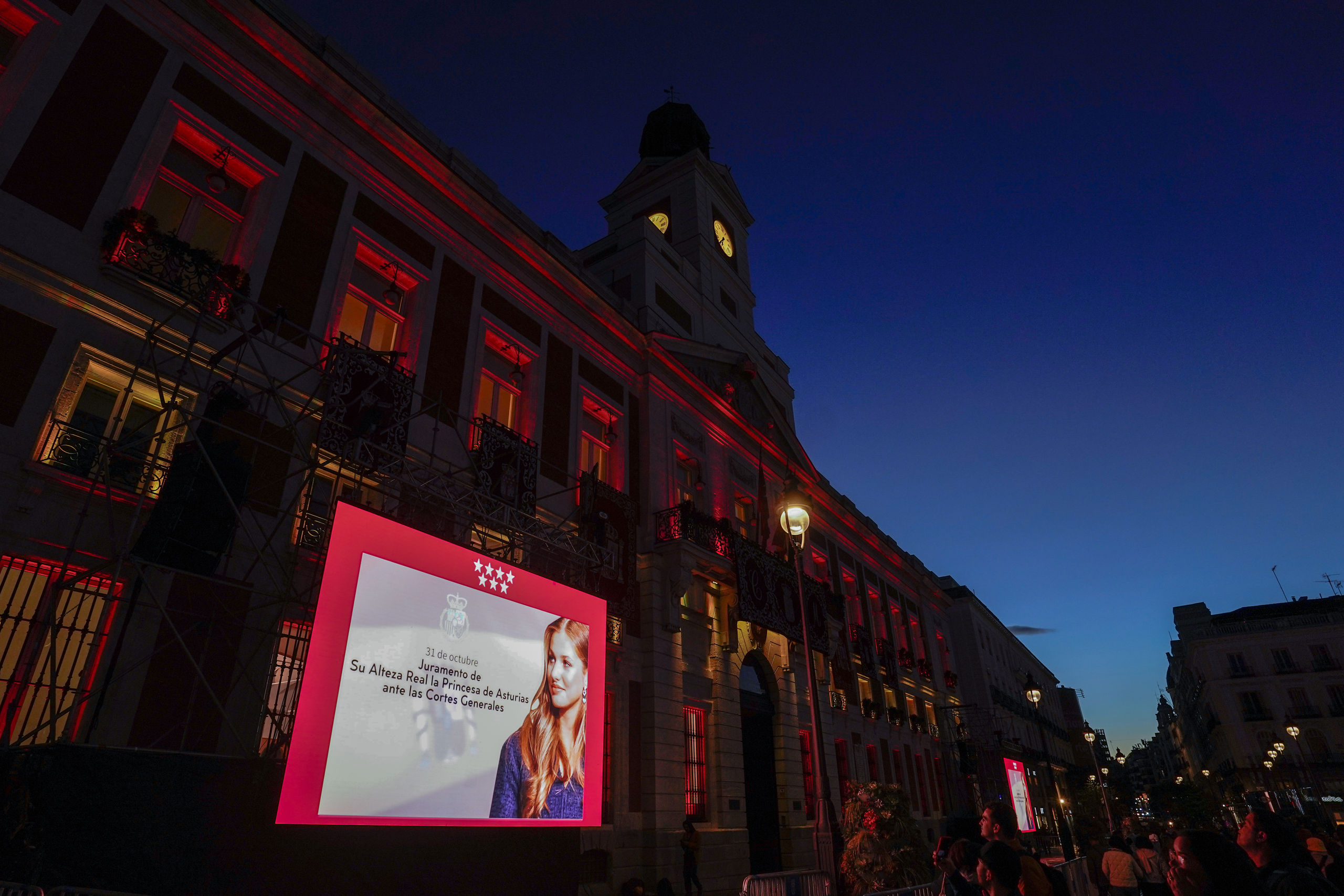 La fachada de la Casa de Correos en la Puerta del Sol, con una gran pantalla con el rostro de la princesa de Asturias.