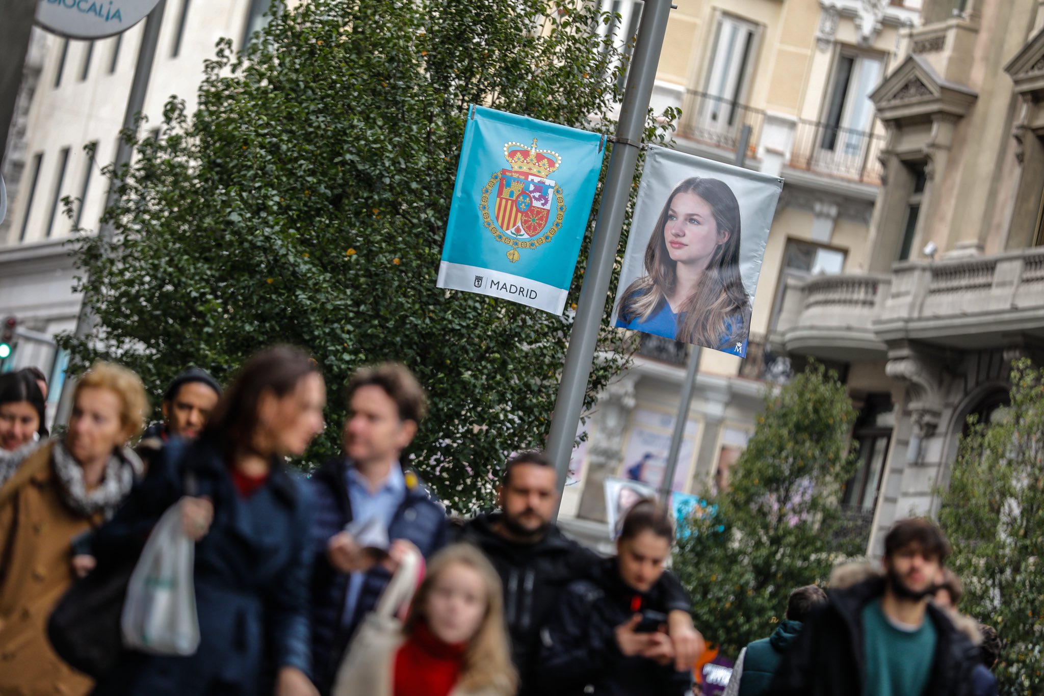 Una de las calles principales de Madrid engalanada con el escudo de la Casa Real y la fotografía de la Princesa Leonor.