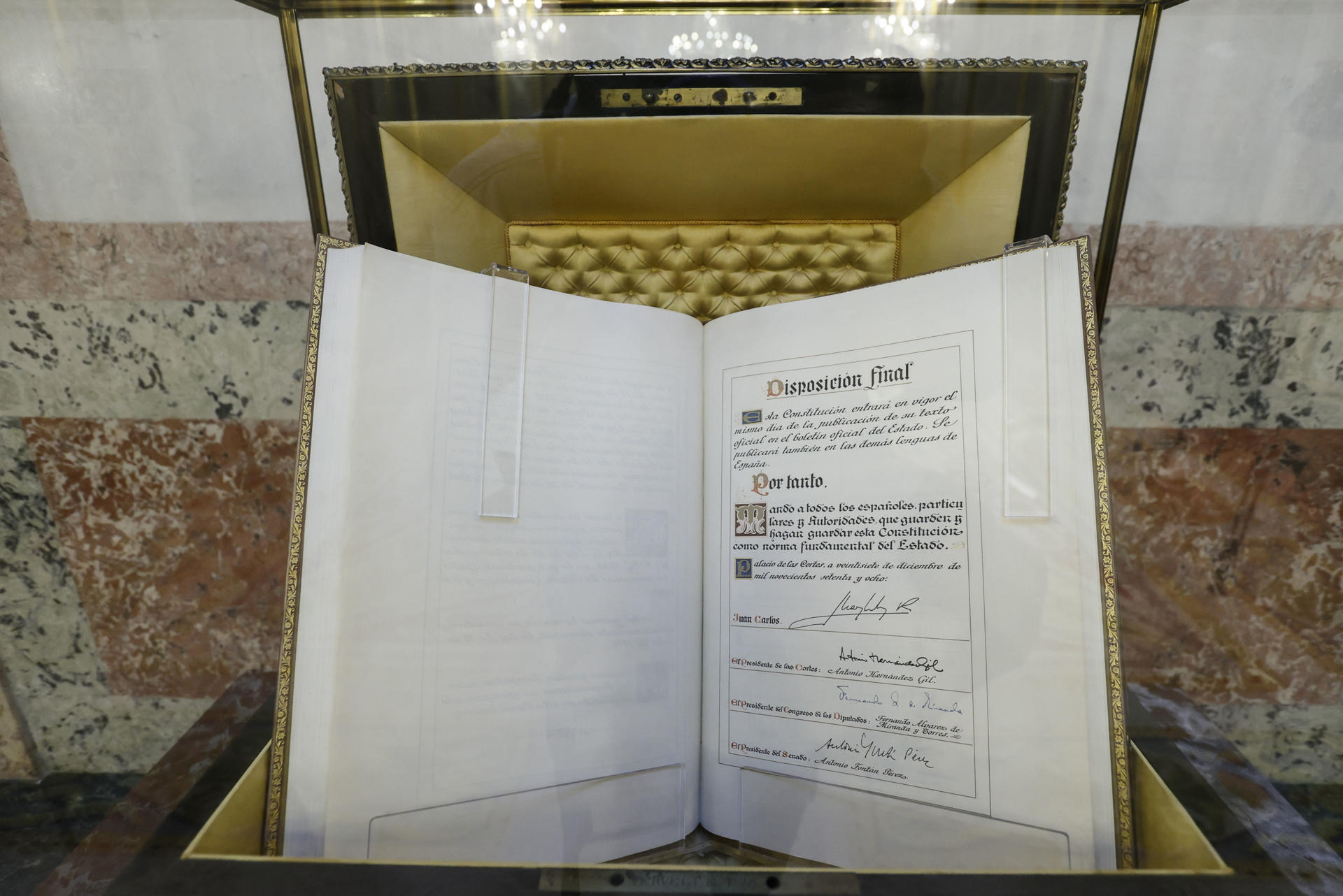 Ejemplar de la Constitución expuesto este viernes en el Congreso de los Diputados en Madrid.