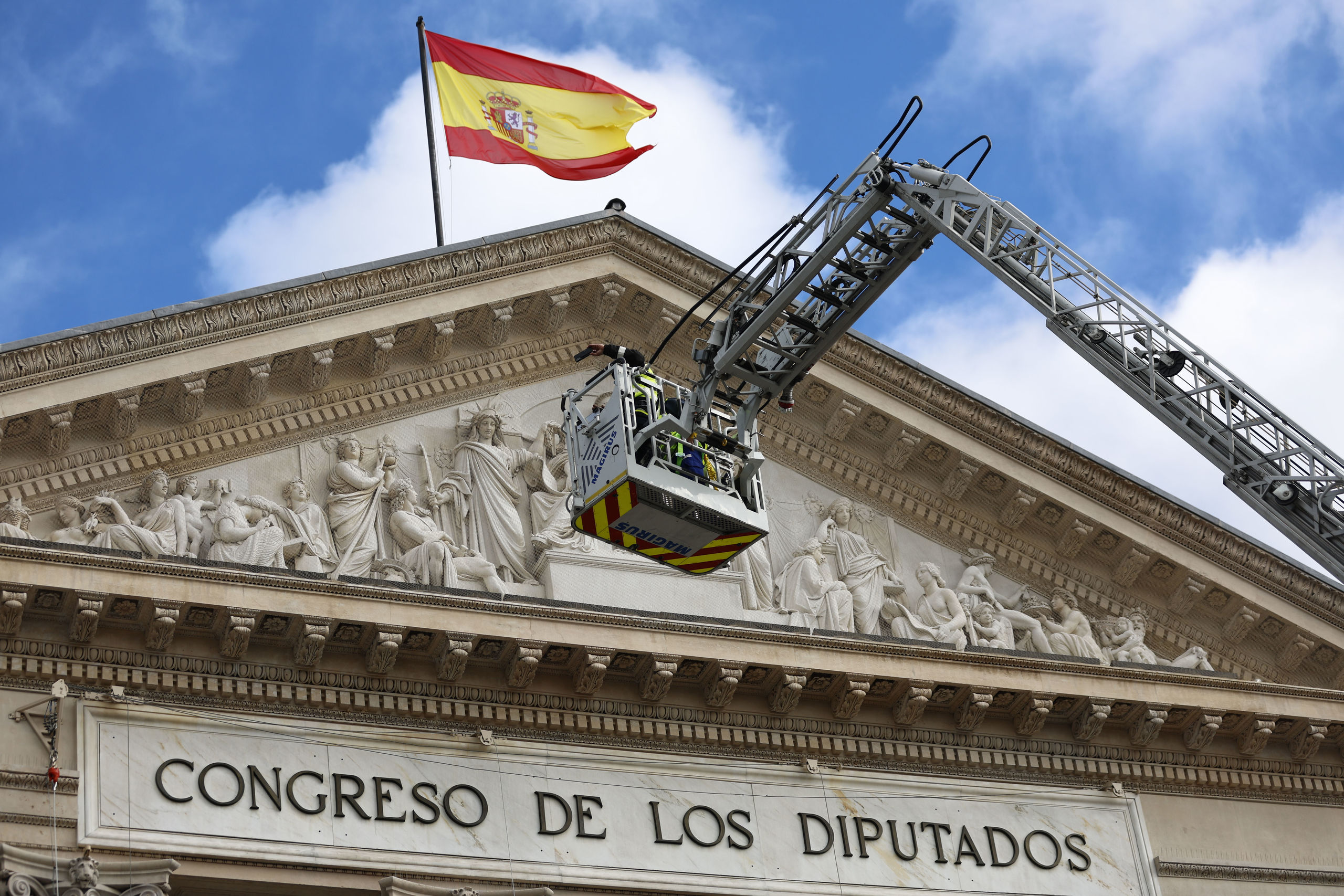 Operarios trabajan en la colocación del Baldaquino de Gala que volverá a adornar la fachada del Palacio del Congreso para la jura de la Constitución de la Princesa de Asturias, este lunes en Madrid