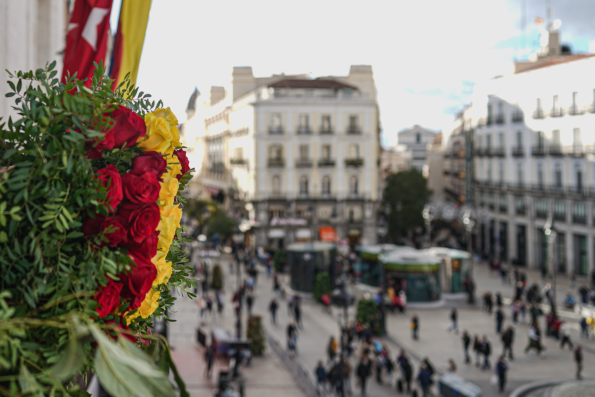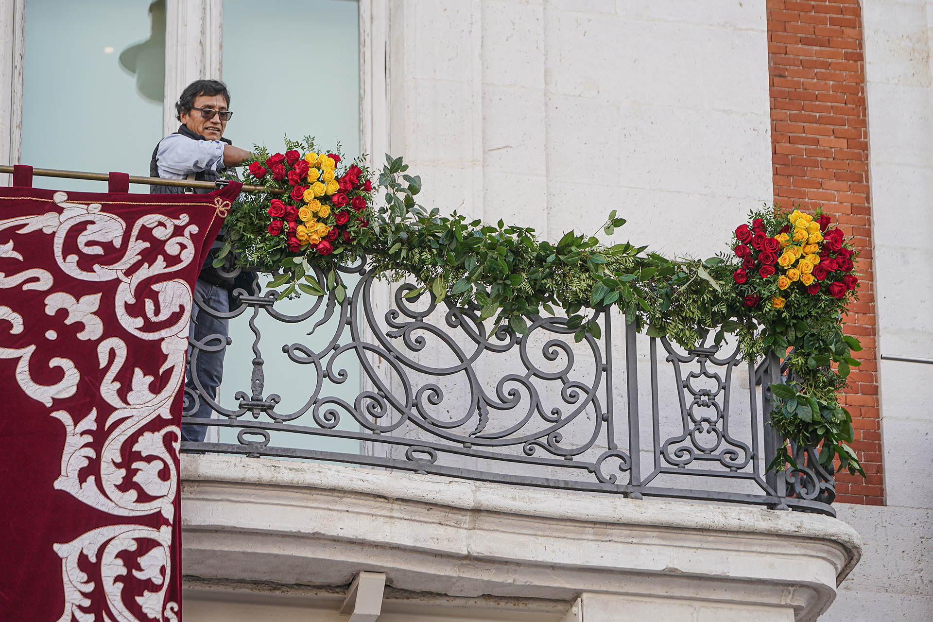 Los balcones de la sede de la Comunidad de Madrid, engalanados con flores con la bandera de España.