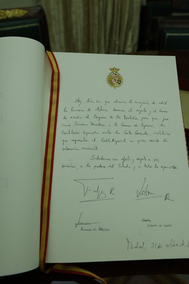 Entre los actos solemnes del día histórico que ha vivido hoy España ha estado la firma de la princesa de Asturias y su familia en el libro de honor del Congreso de los Diputados. Leonor de Borbón ha estampado su firma junto a los Reyes y su hermana Sofía instantes después de la jura de la Constitución en el hemiciclo y tras recibir las medallas del Congreso y del Senado.