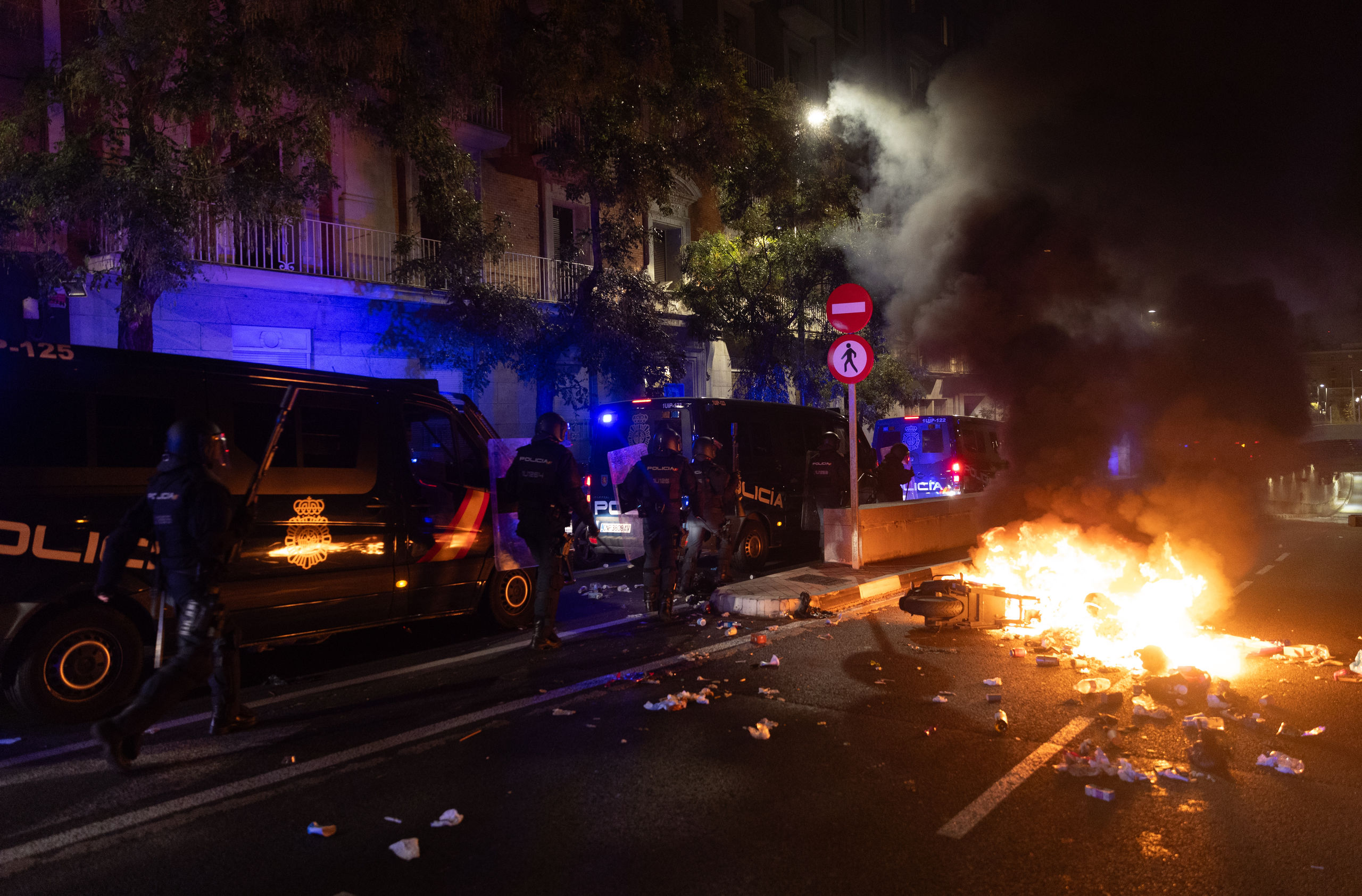 Los ultras que se han enfrentado a la policía tras la concentración en la sede del PSOE en contra de la amnistía han aprovechado para quemar contenedores.