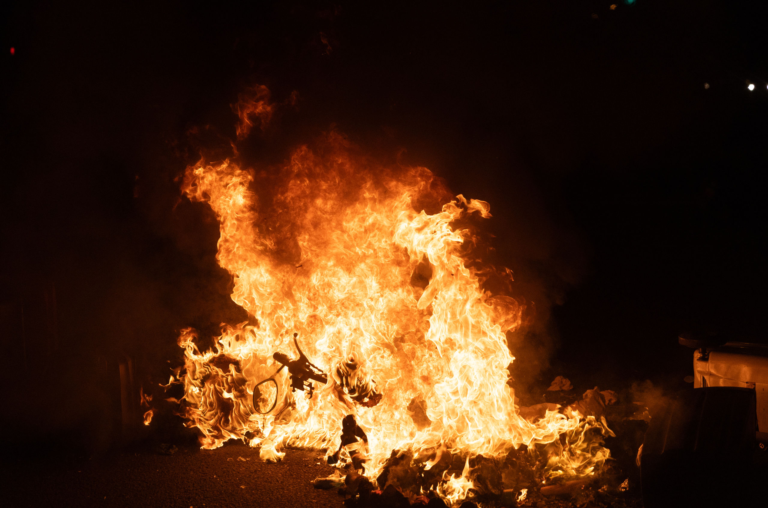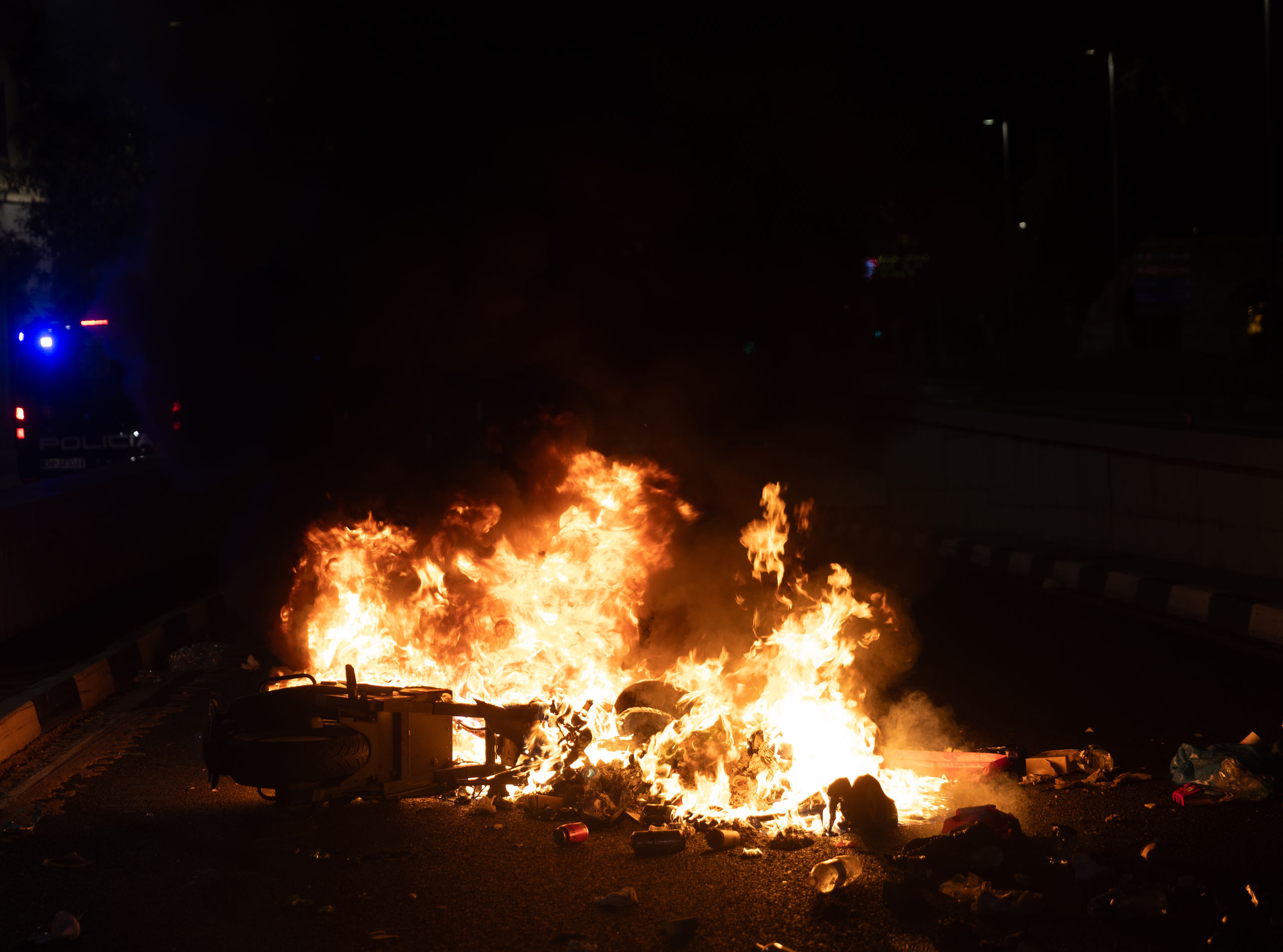 Una de las barricadas hecha por los ultras que han reventado la concentración en la sede del PSOE en contra de la amnistía.