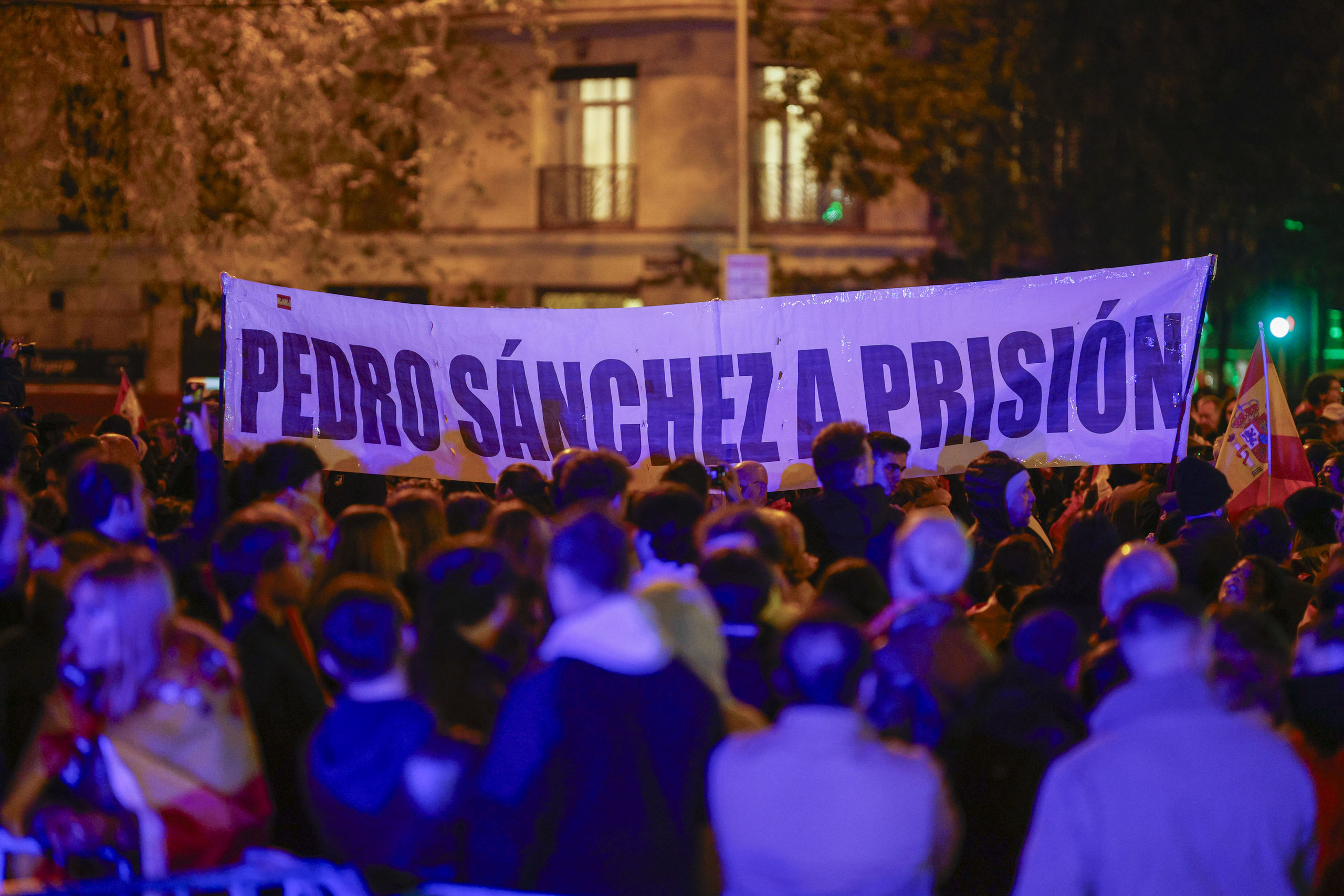 Pancartas con el lema de "Pedro Sánchez a prisión" en la concentración contra la amnistía a los golpistas.