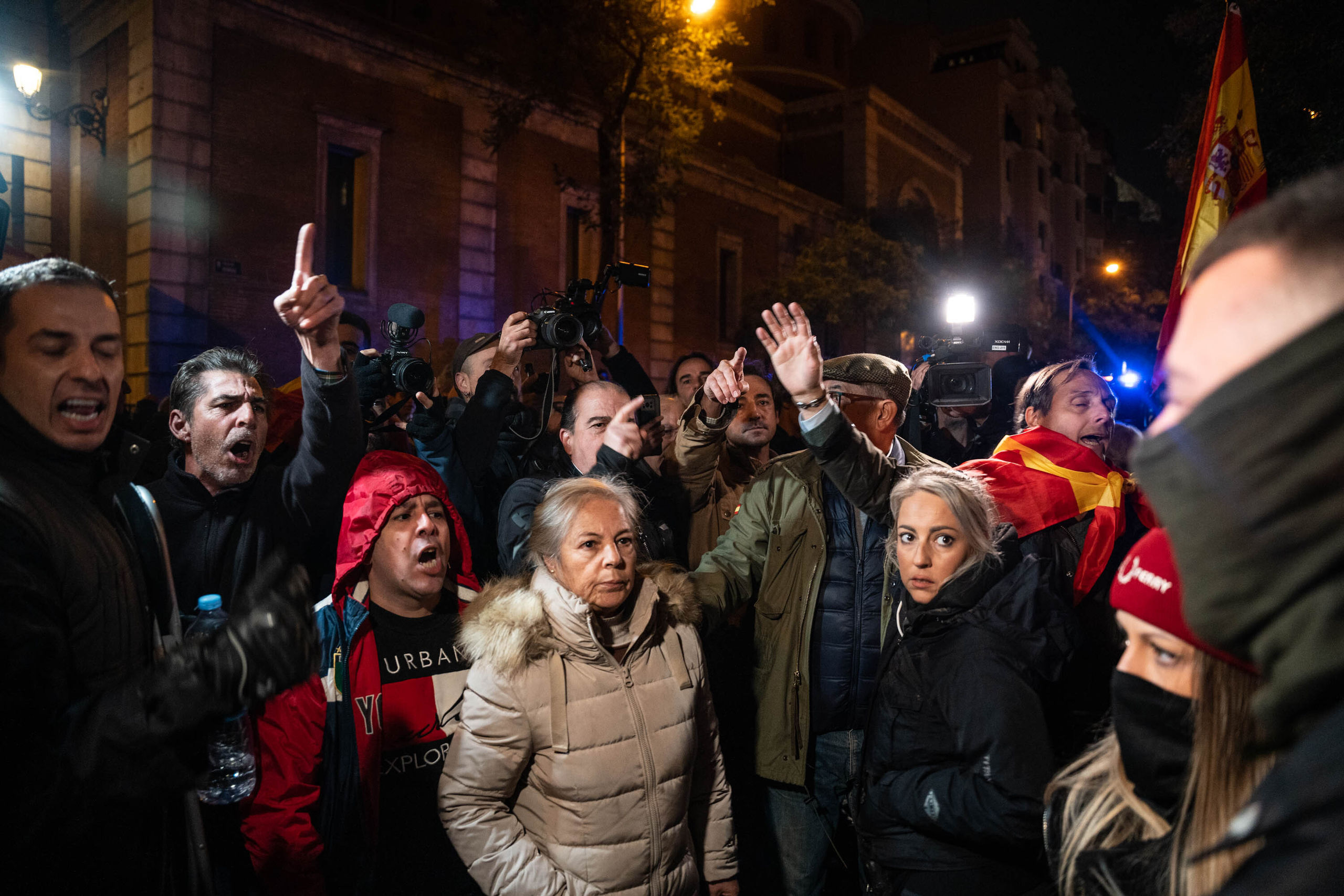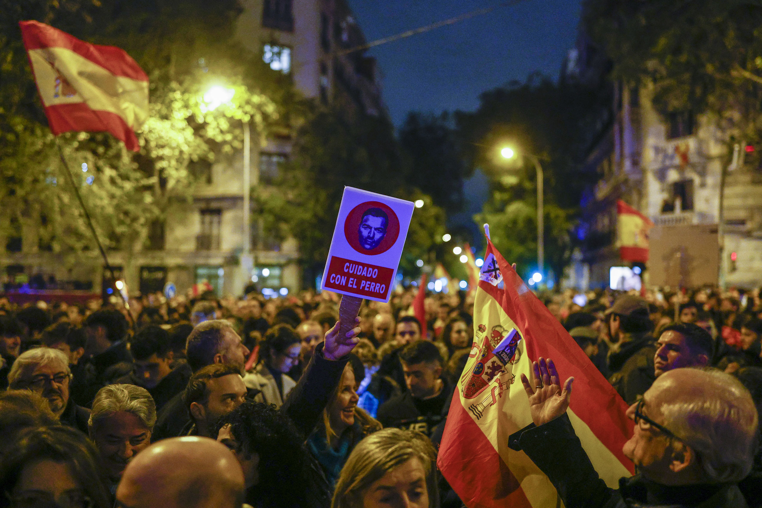Una noche más miles de personas se concentran en las inmediaciones de la sede del PSOE en la calle Ferraz para protestar contra la amnistía.