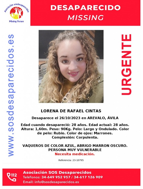La asociación SOS Desaparecidos ha activado este jueves la alerta internacional de búsqueda a través de la Red de cajeros automáticos de Euronet para encontrar a Lorena de Rafael Cintas, una mujer de 28 años que se fugó el pasado 26 de octubre del centro psiquiátrico de Arévalo (Ávila) en el que estaba ingresada -por orden judicial-, aprovechando un permiso que le concedieron para salir a pasear.