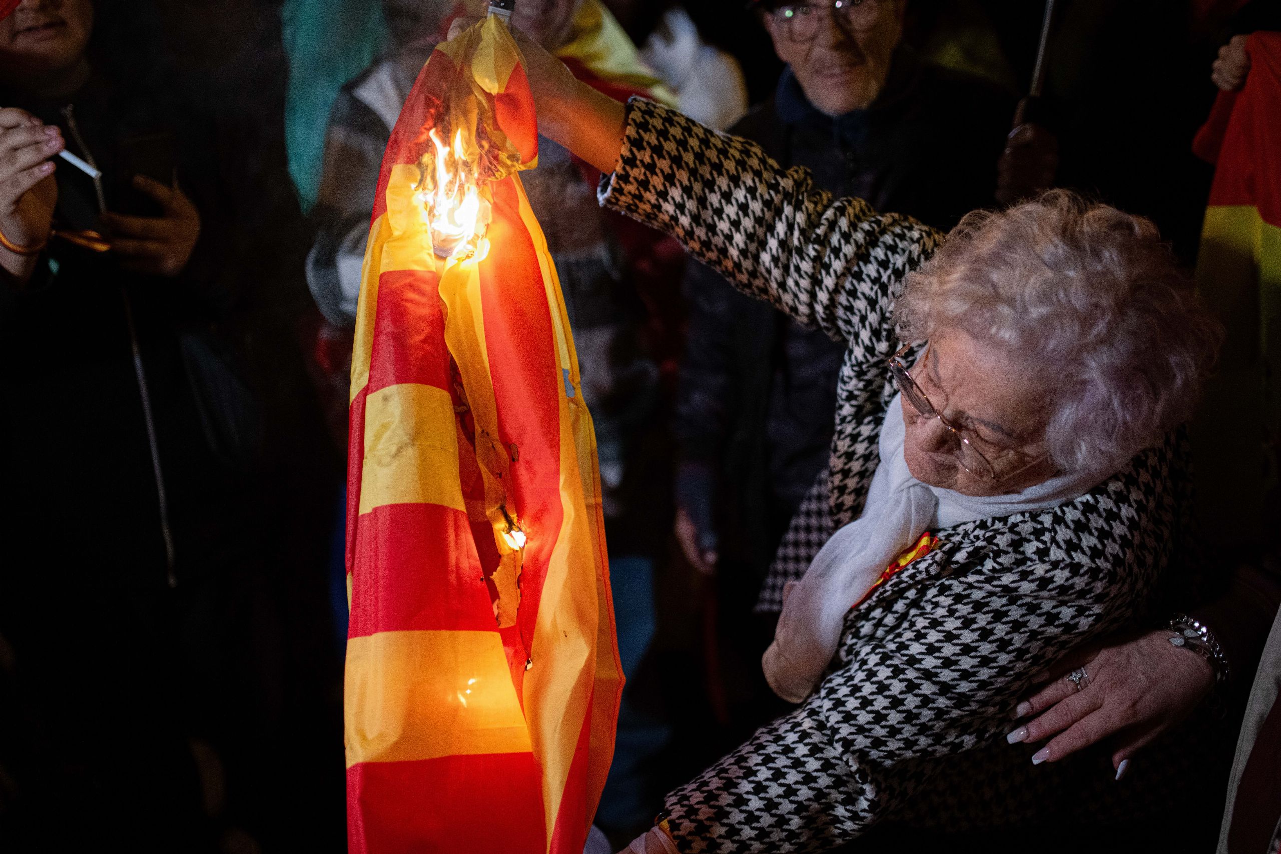 Una señora quema una bandera catalana, durante la protesta contra la amnistía ante la Delegación del Gobierno en Barcelona.