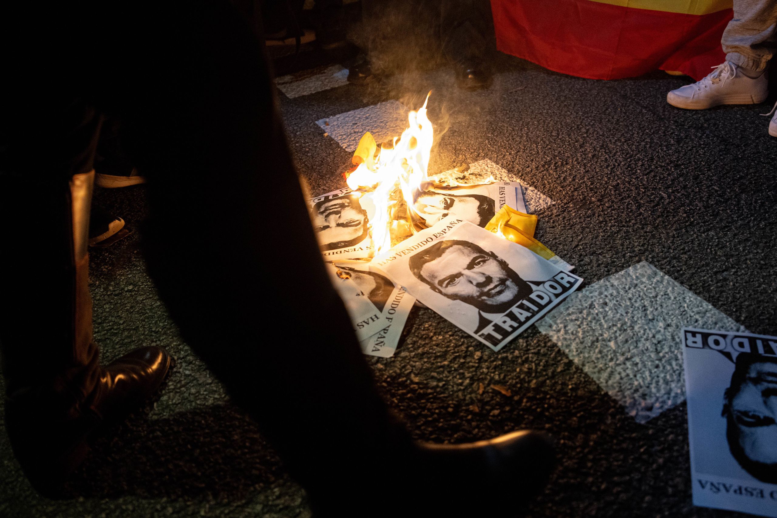 Queman panfletos con la cara de Pedro Sánchez y el lema de "Traidor" en la concentración contra la amnistía ante la Delegación del Gobierno en Barcelona.
