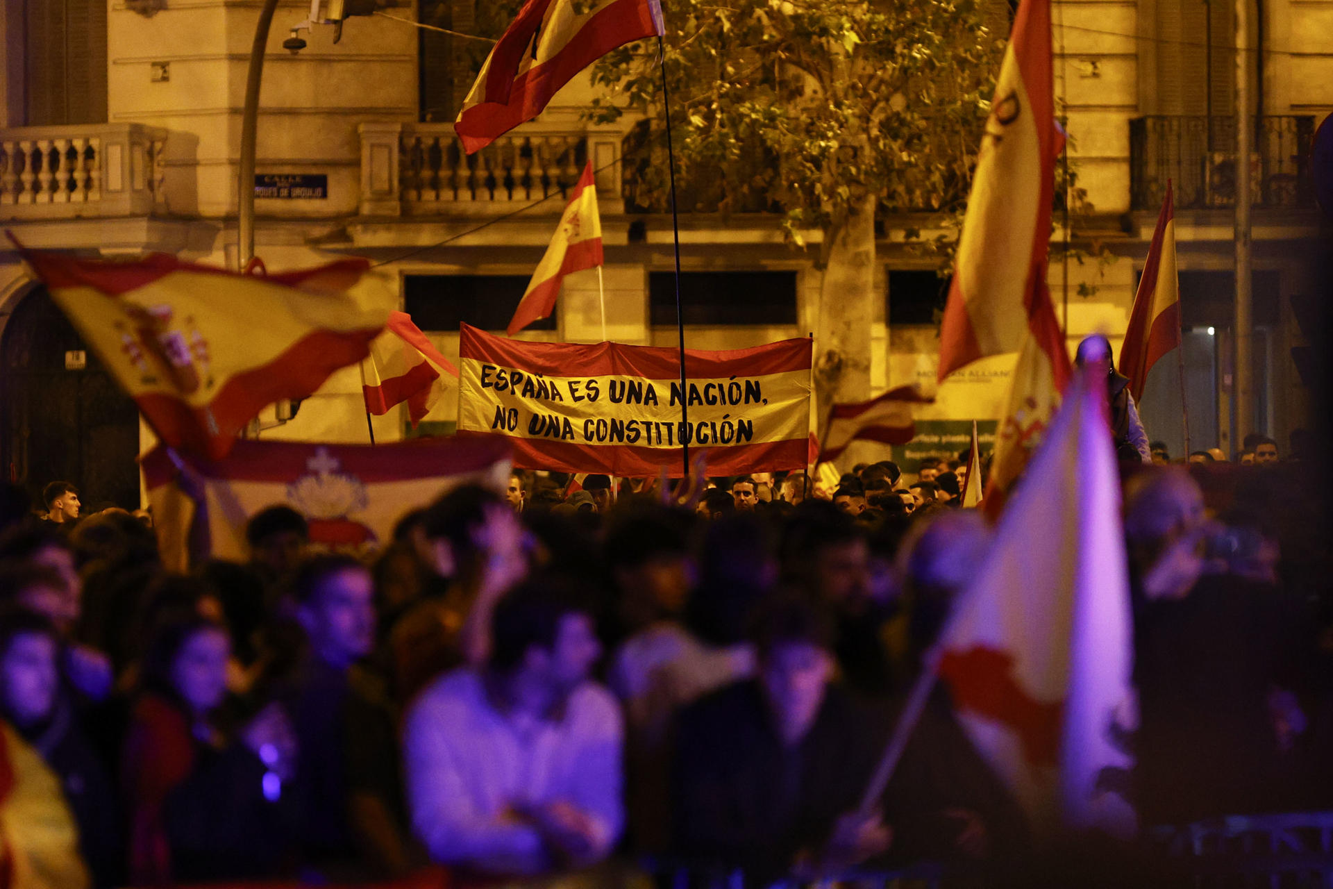 Una pancarta con "Cataluña es España" tras las vallas que protegen la sede de Ferraz de los manifestantes que noche tras noche se congregan para protestar por el pacto del PSOE y Junts para investir a Pedro Sánchez a cambio de la amnistía de los golpistas catalanes y otras muchas concesiones.
