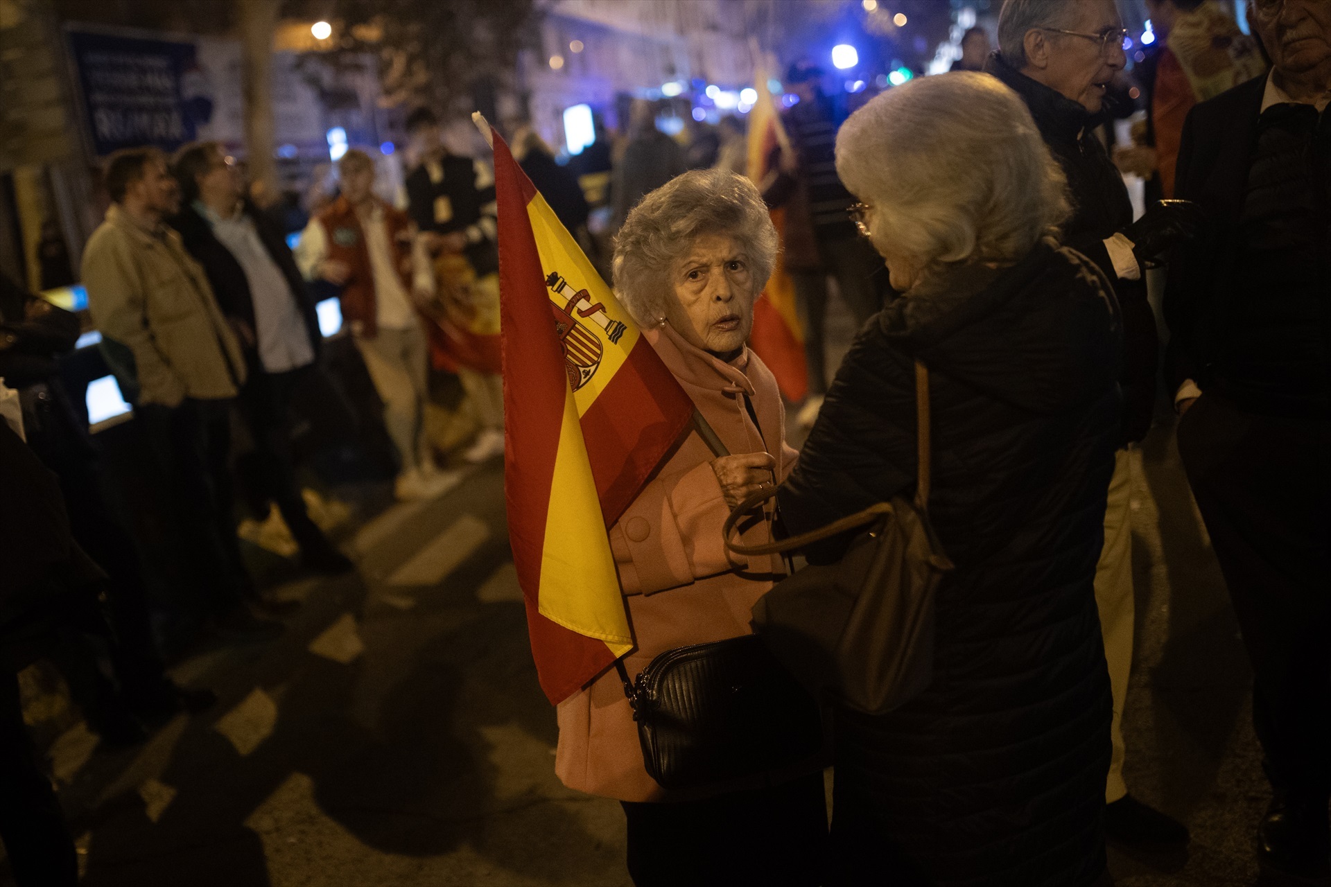 Dos señoras con la bandera de España en la sede de Ferraz para protestar por la amnistía