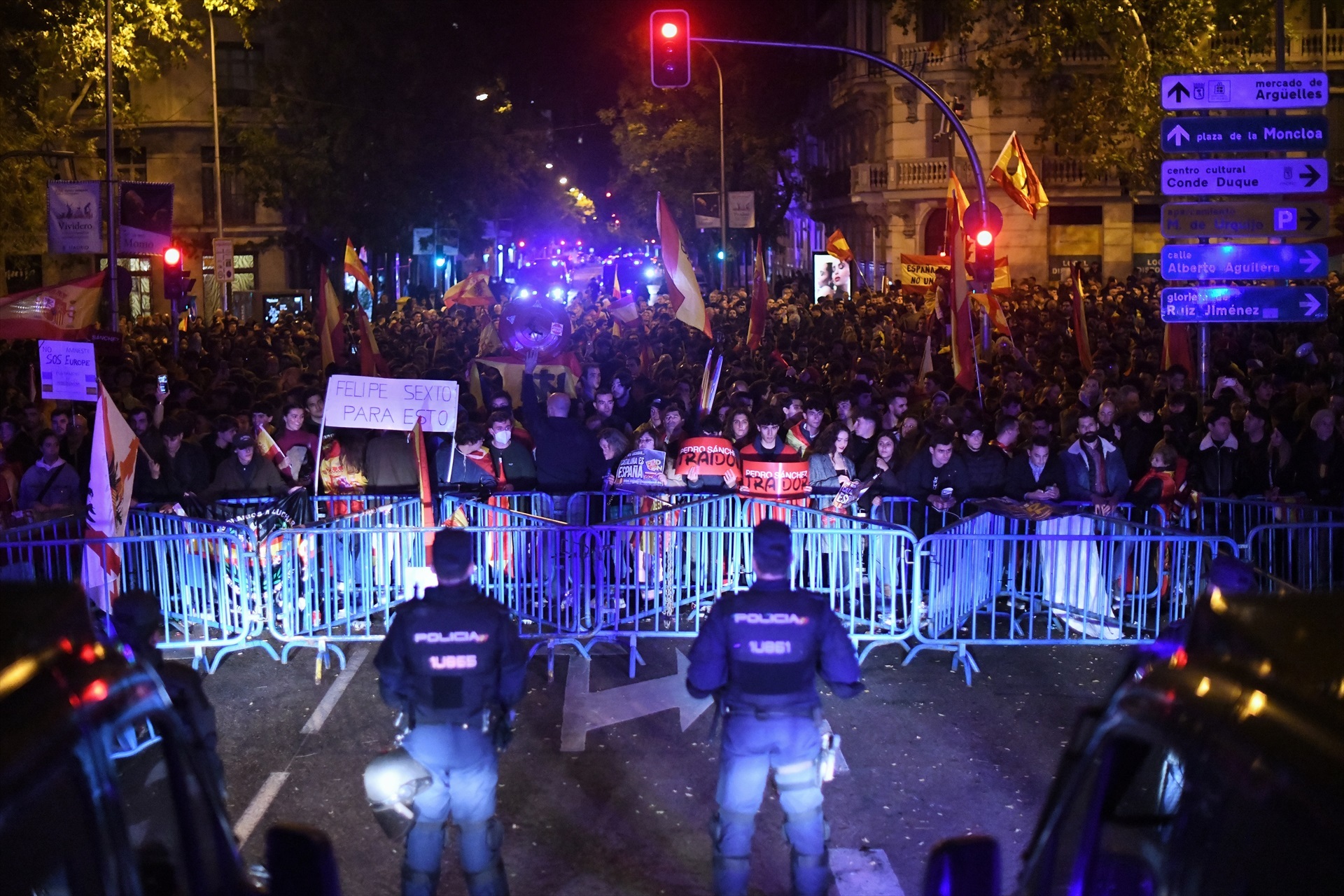 Participantes de la protesta ante la sede socialista en Ferraz corean diferentes consignas, entre las que se han escuchado insultos y gritos dirigidos contra el presidente del Gobierno (“Sánchez, macarra, eres un etarra”, “Madrid será la tumba del sanchismo”), el rey Felipe VI, el expresidente catalán, el prófugo de la justicia Carles Puigdemont, y también contra Arnaldo Otegi.