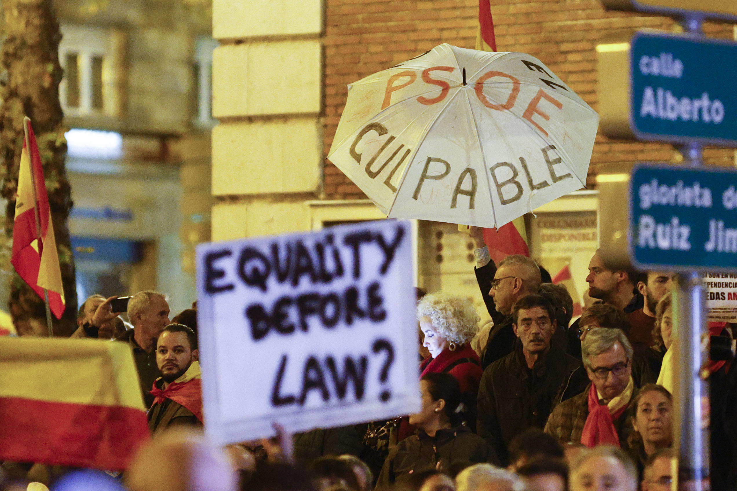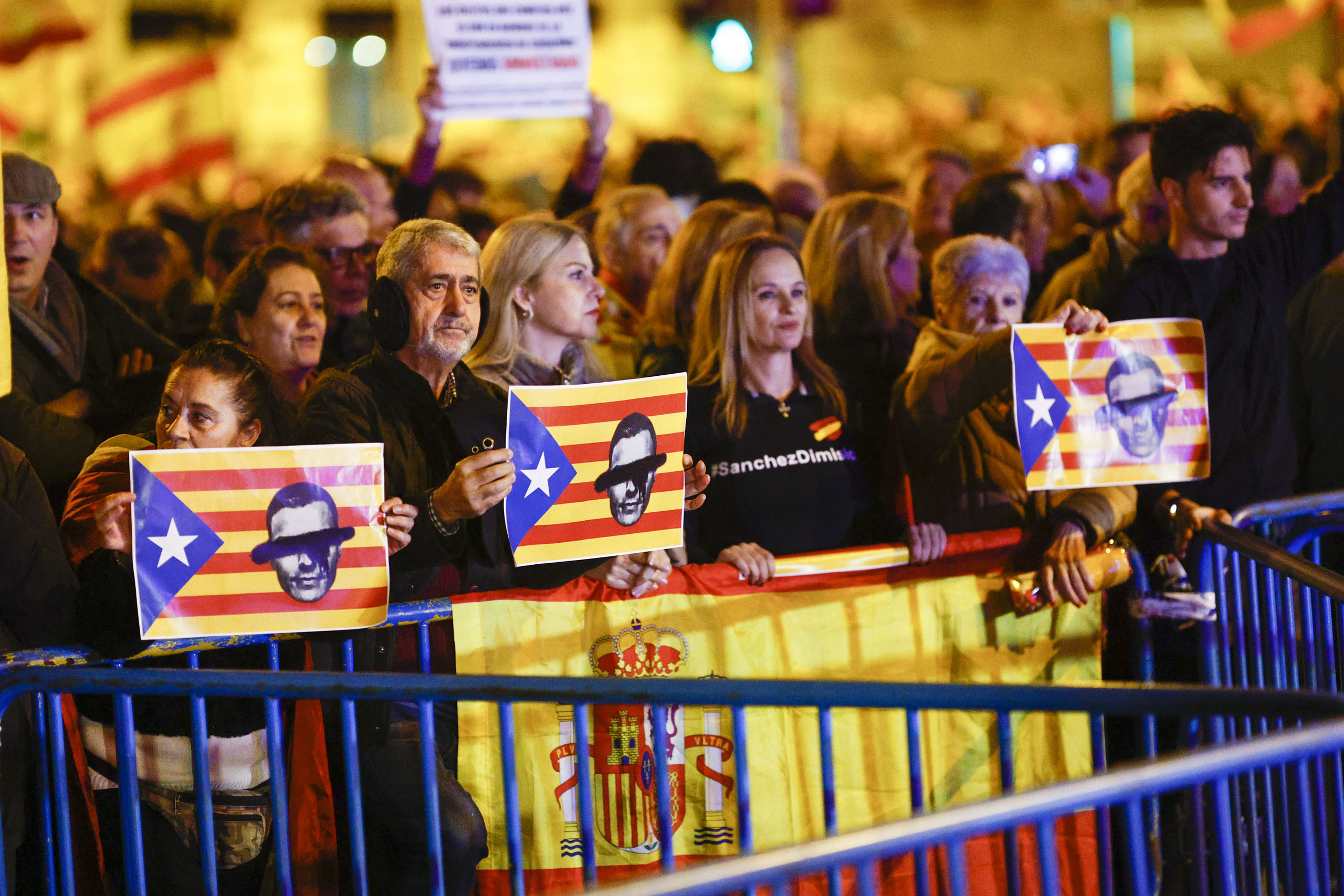 Asistentes a la concentración en contra de la amnistía celebrada este lunes en las inmediaciones de la sede del PSOE en Ferraz, Madrid.