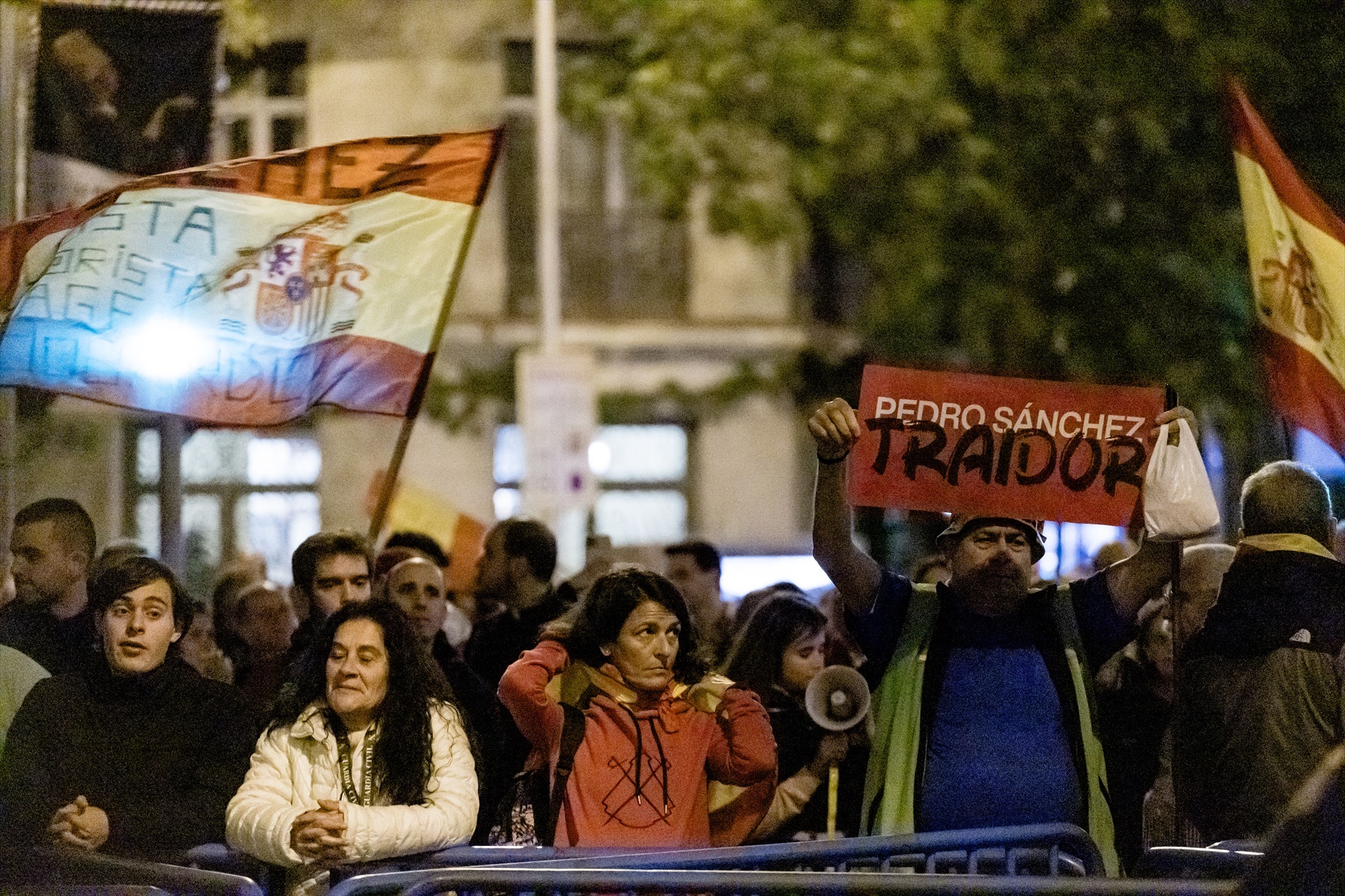 Una noche más, y van 17 consecutivas, un grupo de ciudadanos no muy numeroso se manifiesta en las cercanías de la sede del PSOE en Ferraz para protestar contra los pactos de Sánchez y los separatistas.