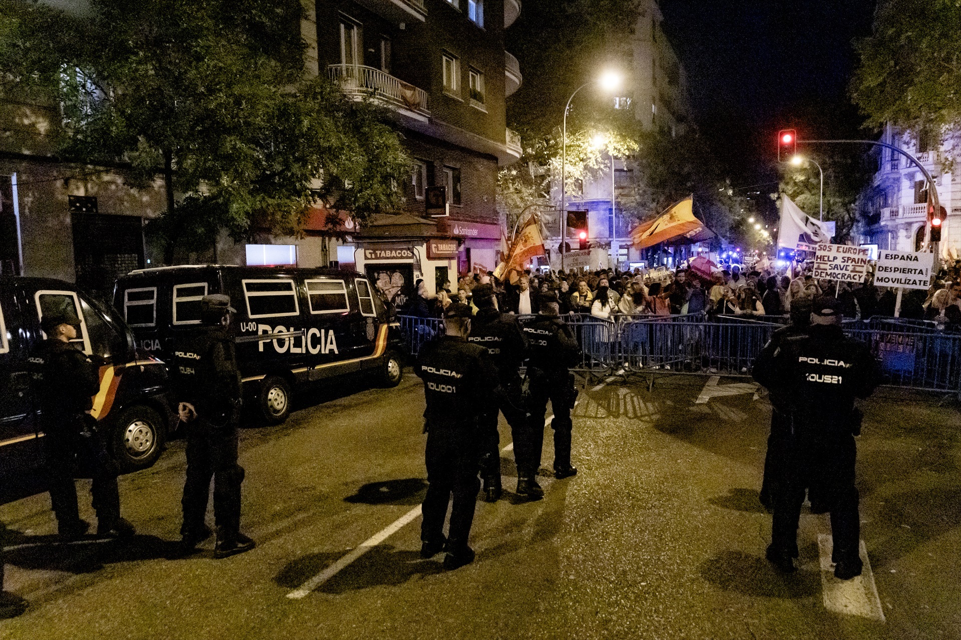Unas decenas de manifestantes se concentran de nuevo cerca de la sede del PSOE en Ferraz, a la que no pueden acercarse por la colocación de vallas y el amplio dispositivo policial.