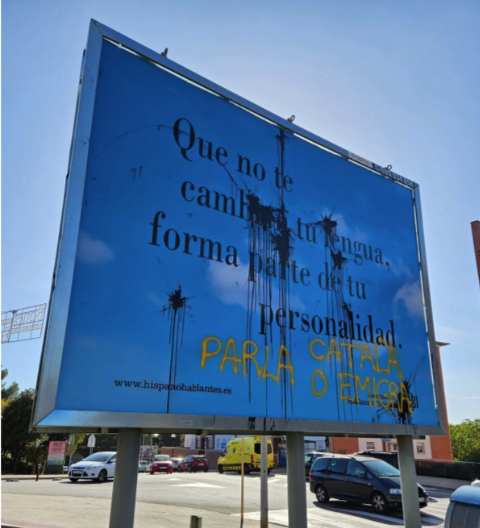 Unos desconocidos lanzaron pintura roja sobre el cartel y dejaron su firma con la referida advertencia, o la aceptación del catalán como lengua única o la expulsión de la comunidad autonómica. En un comunicado emitido por la entidad, se informa de que "hace diez días Hablamos Español comenzó una campaña en las comunidades autónomas con cooficialidad lingüística con el lema a favor de la Libertad de Elección de Lengua, "Que no te cambien tu lengua, forma parte de tu personalidad". Todavía no la hemos presentado, a la espera de tener todos los soportes operativos y ya nos han estropeado una y censurado otra".