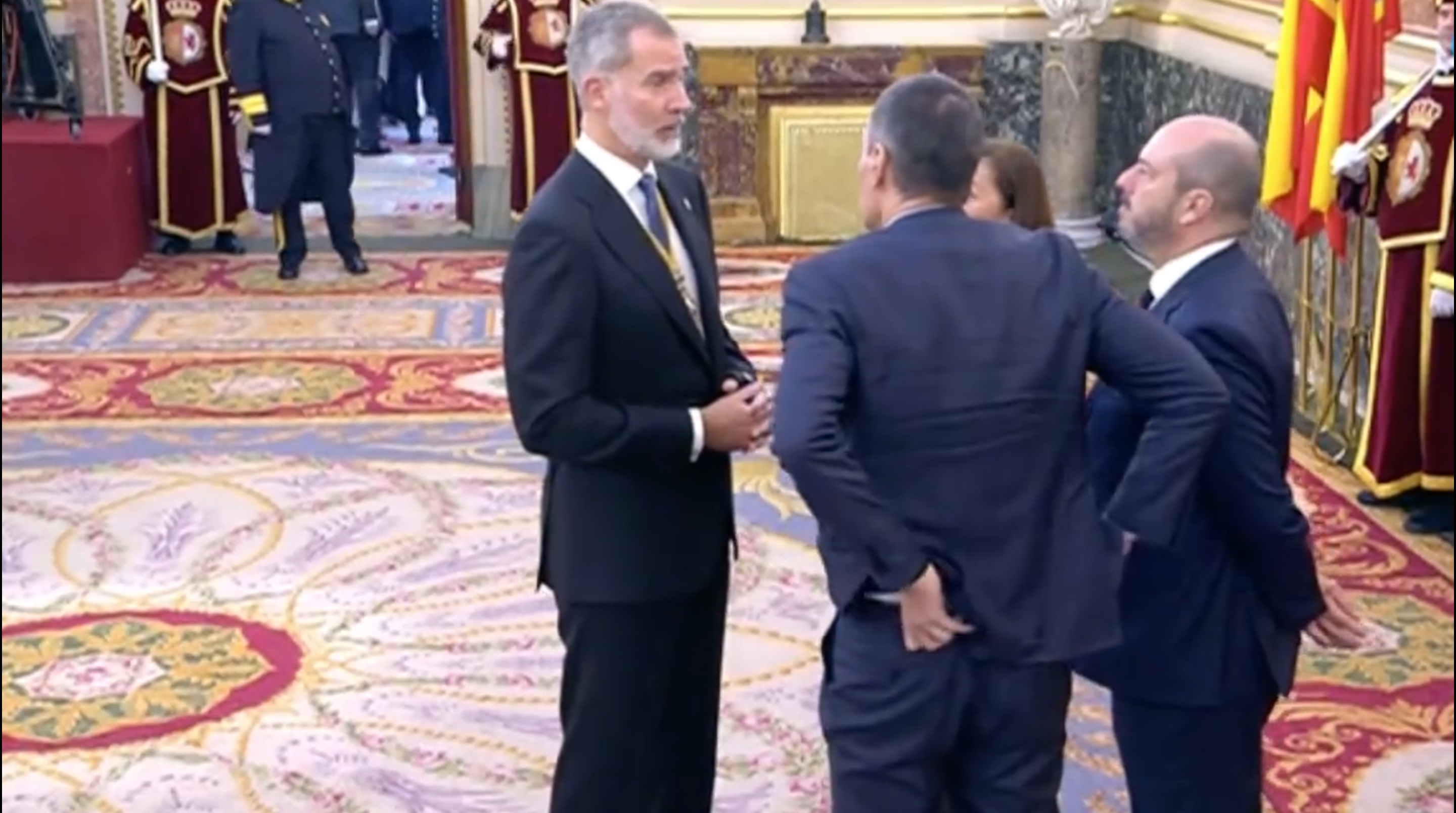 Tras finalizar el discurso del rey Felipe VI en la apertura solemne de las Cortes Generales, fuera ya del hemiciclo se ha formado un corrillo informal del Rey con la presidenta del Congreso, Francina Armengol, el del Senado, Pedro Rollán, y el presidente del Gobierno, Pedro Sánchez.