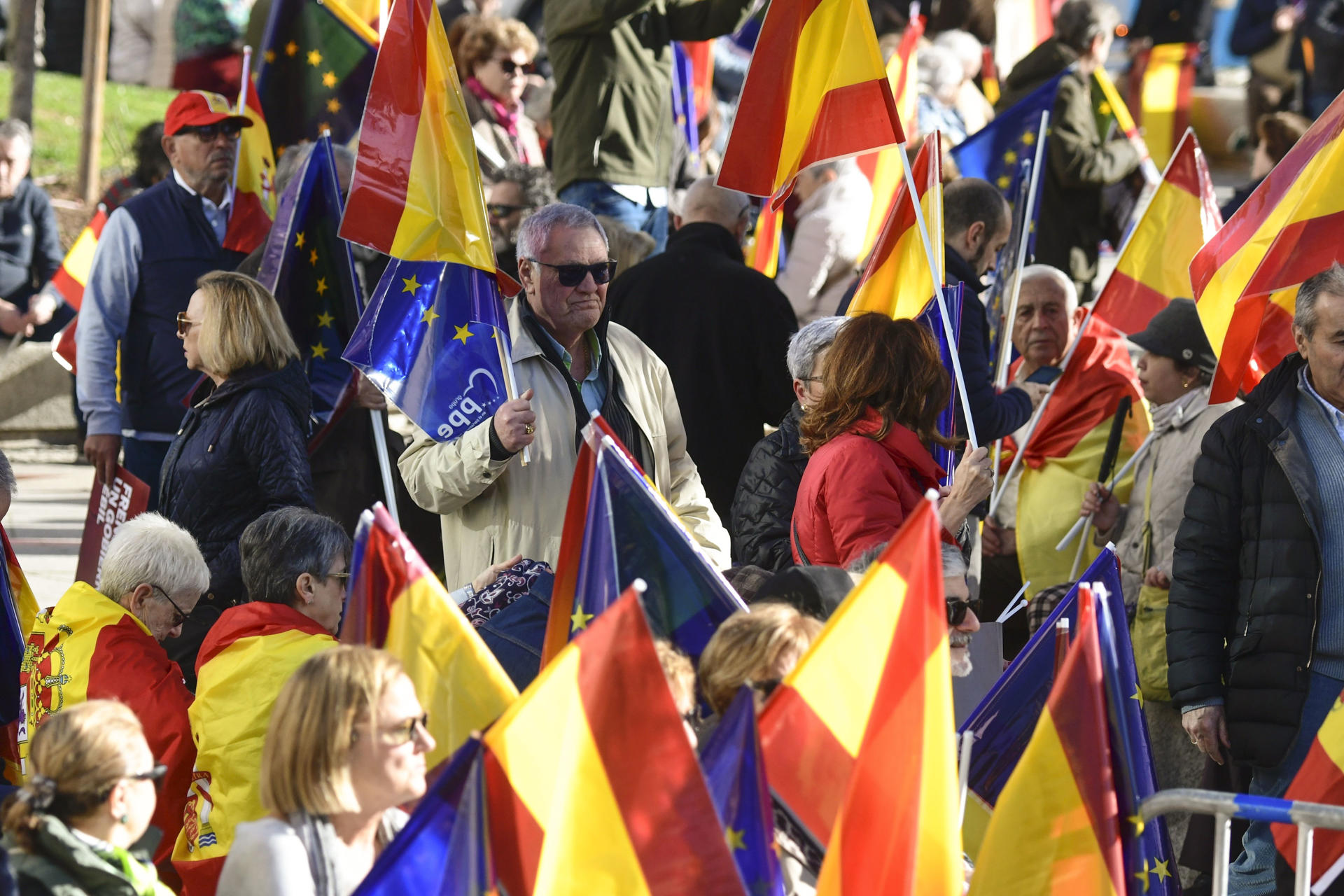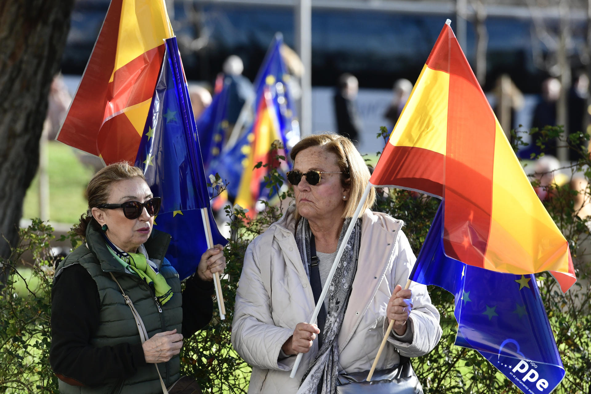 Los manifestantes convocados por el PP portan banderas y pancartas contra la amnistía.