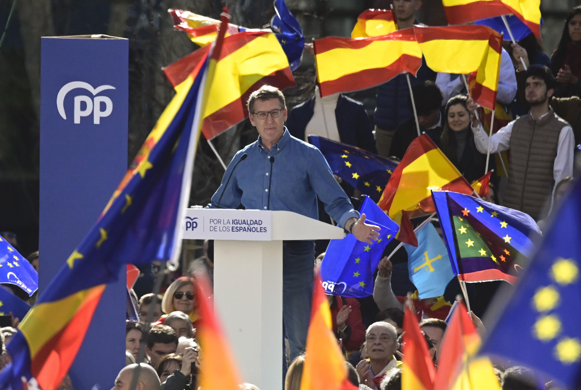 El líder del Partido Popular, Alberto Núñez Feijóo, interviene durante la concentración convocada por su partido en la Plaza de España en Madrid en contra de la amnistía.