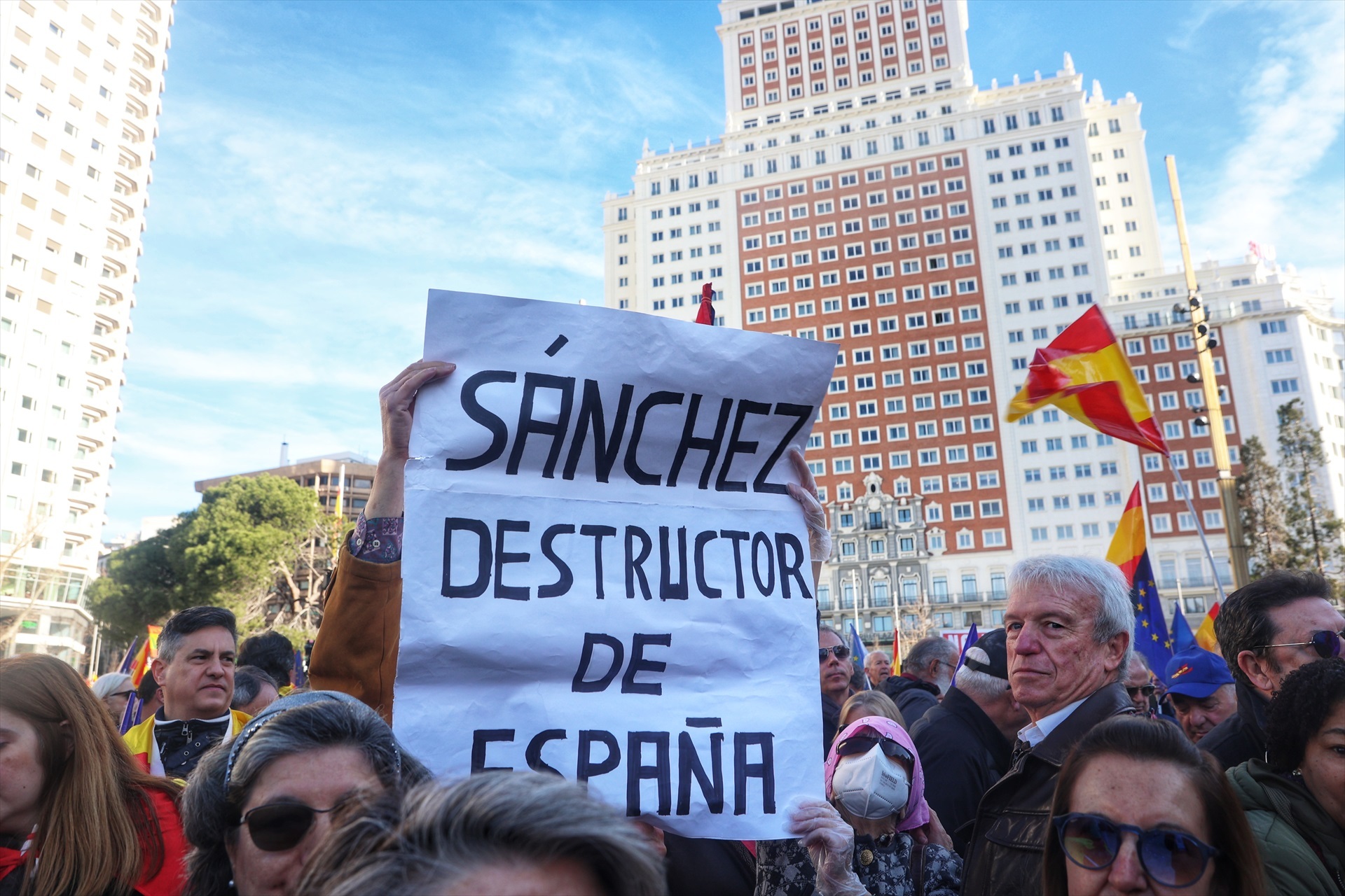 Manifestantes en la Plaza de España portando pancartas contra Sánchez y los nacionalismos.