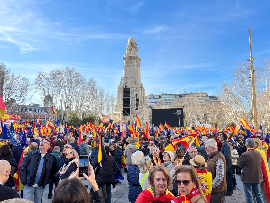 Decenas de manifestantes se concentran ya en la plaza de España de Madrid, donde el Partido Popular ha convocado para este domingo una concentración en contra de la ley de amnistía que Sánchez ha regalado a los separatistas a cambio de su apoyo para permanecer en el Palacio de la Moncloa.