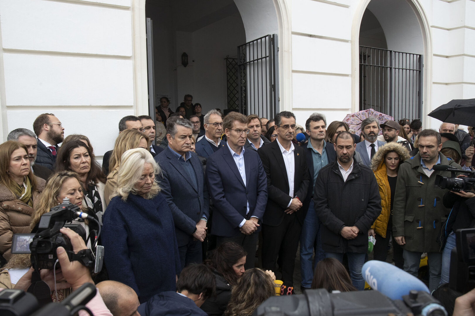 Feijóo, que ha asegurado que no iba a responder a preguntas sobre ese asunto por respeto a lo sucedido en Barbate, ha cargado contra Pedro Sánchez por "irse a un festival de cine", los Goya, tan solo unas horas después del fallecimiento de los agentes de la Benemérita.