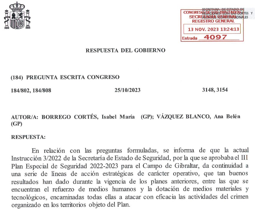 "En relación con las preguntas formuladas, se informa de que la actual Instrucción 3/2022 de la Secretaría de Estado de Seguridad, por la que se aprobaba el III Plan Especial de Seguridad 2022-2023 para el Campo de Gibraltar, da continuidad a una serie de líneas de acción estratégicas de carácter operativo, que tan buenos resultados han dado durante la vigencia de los planes anteriores, entre las que se encuentran el refuerzo de medios humanos y la dotación de medios materiales y tecnológicos, encaminadas todas ellas a atacar con eficacia las actividades del crimen organizado en los territorios objeto del Plan", dijo la respuesta del Gobierno, fechada el 10 de noviembre pasado.