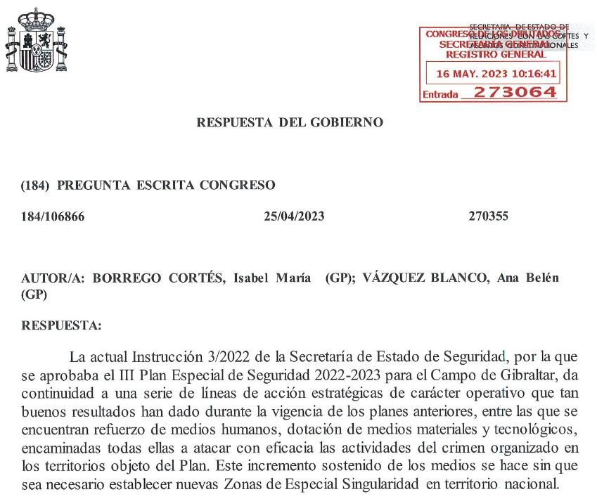Una respuesta casi calcada a la que había recibido meses antes las dos diputadas del PP, en mayo de 2023, cuando un mes antes sí habían preguntado específicamente por la provincia de Cádiz. Pero en esa respuesta, además, el Gobierno no sólo ve vanagloriaba de los buenos resultados del plan Marlaska, sino de que hubieran dado resultados sin necesidad de declarar a la provincia como Zona de Especial Singularidad.