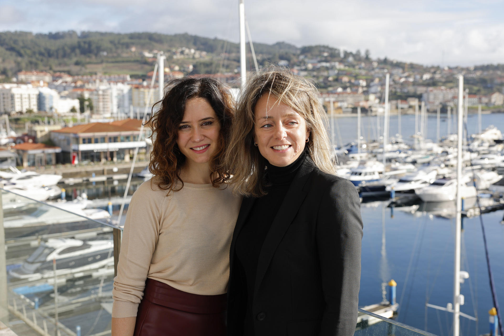 Después de participar en un mitin este jueves por la noche con el candidato y presidente de la Xunta, Alfonso Rueda, en Vigo, la presidenta madrileña se trasladó hasta Sanjenjo, donde tuvo un encuentro con empresarios gallegos. En la imagen con el alcalde de la localidad, Telmo Martín, en la terraza del Náutico.
