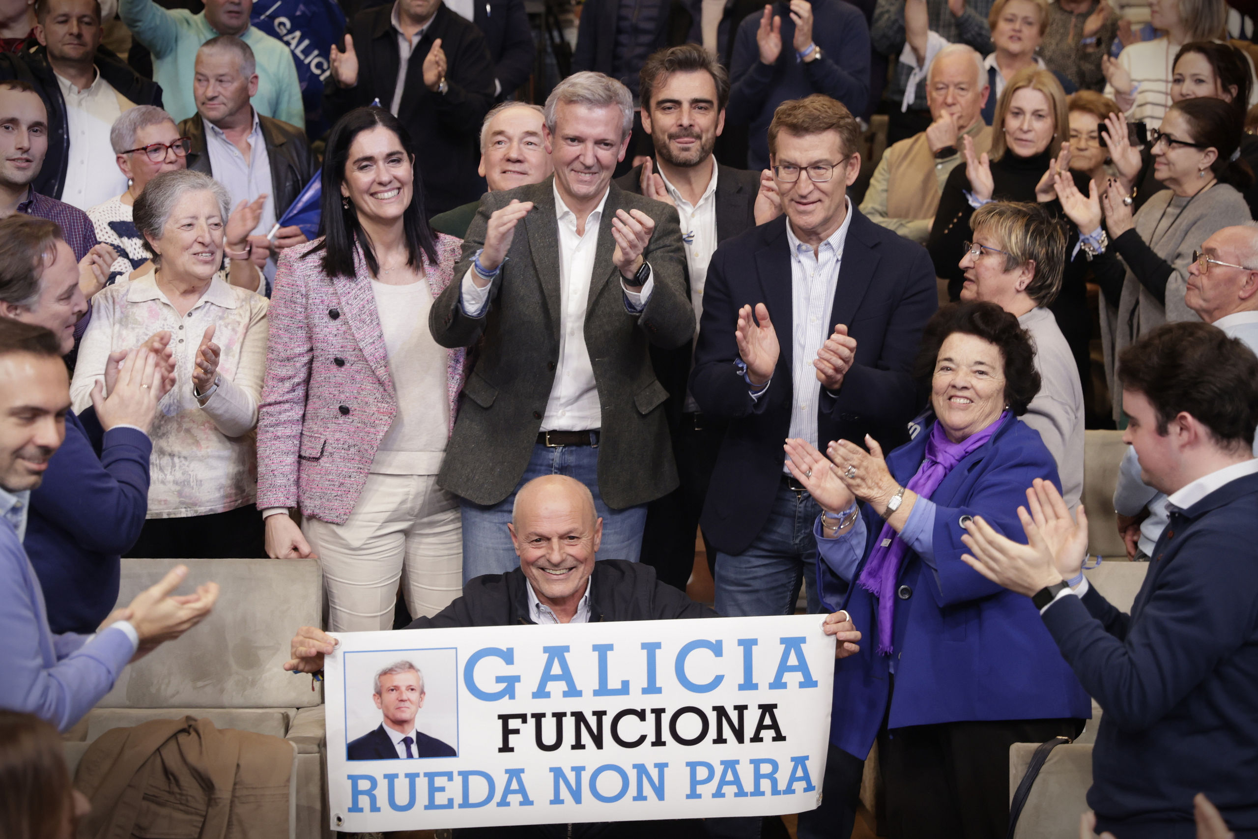 El presidente del PP, Alberto Núñez Feijóo, el candidato a la presidencia de la Xunta de Galicia, Alfonso Rueda, el presidente provincial de los populares, Diego Calvo, y la secretaria general en Galicia, Paula Prado en el mitin de cierre de campaña en La Coruña.