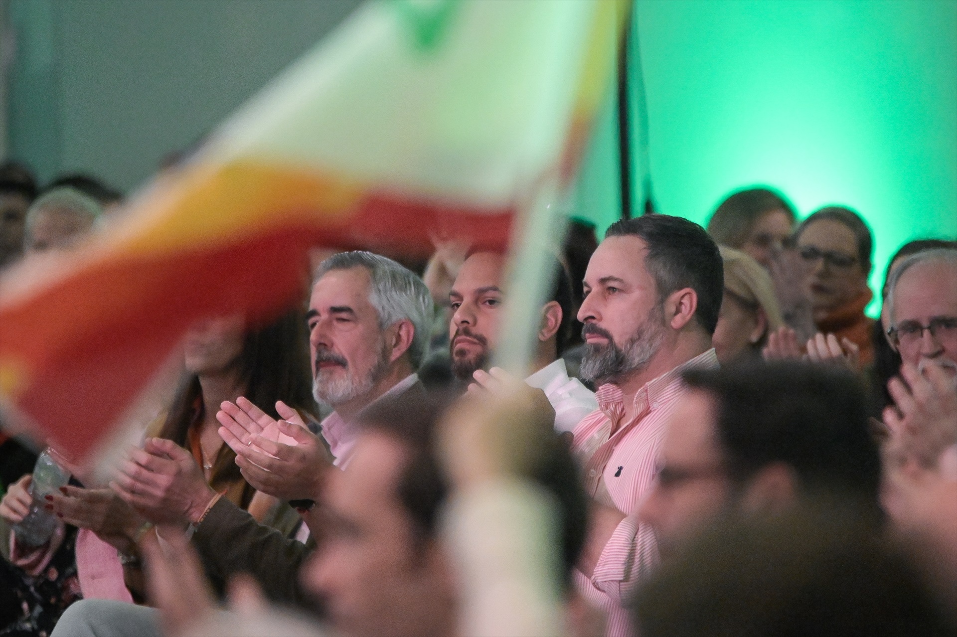 El candidato a la Presidencia de la Xunta de Galicia y cabeza de lista de Vox por Pontevedra, Álvaro Díaz-Mella; el secretario general de Vox, Ignacio Garriga y el líder de Vox, Santiago Abascal, durante el cierre de la campaña electoral de Vox, en el Hotel Attica21. Su difícil reto es entrar en la cámara gallega.