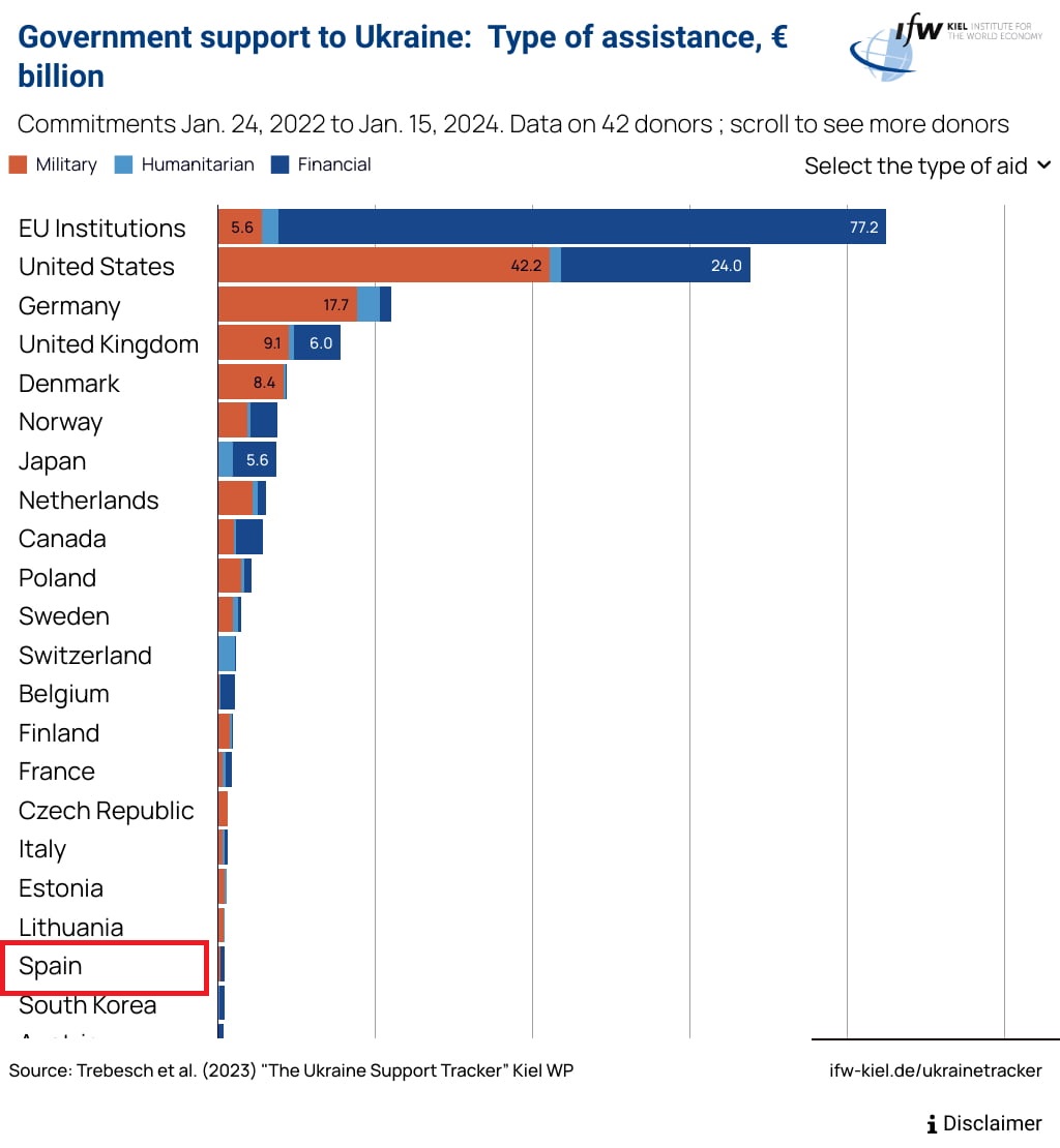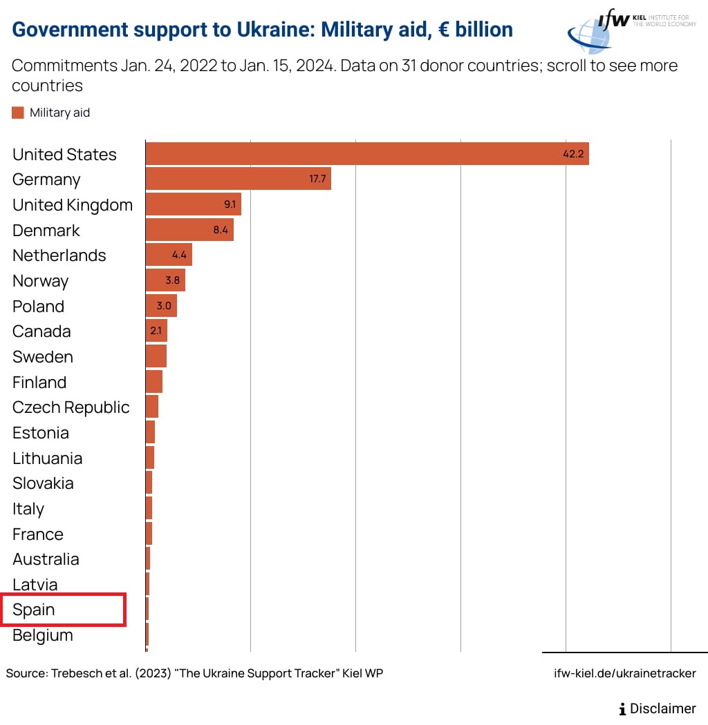 En lo que a la ayuda estrictamente militar se refiere, el estudio sitúa a al Gobierno de España como el decimonoveno contribuyente, por detrás de países con ejércitos y economías mucho más pequeñas, como República Checa, Estonia, Lituania, Eslovaquia o Letonia, o por detrás de países más potentes militarmente pero muchísimo más lejanos, con los problemas logísticos que supone transferir esa ayuda, como pueden ser Australia o Canadá.