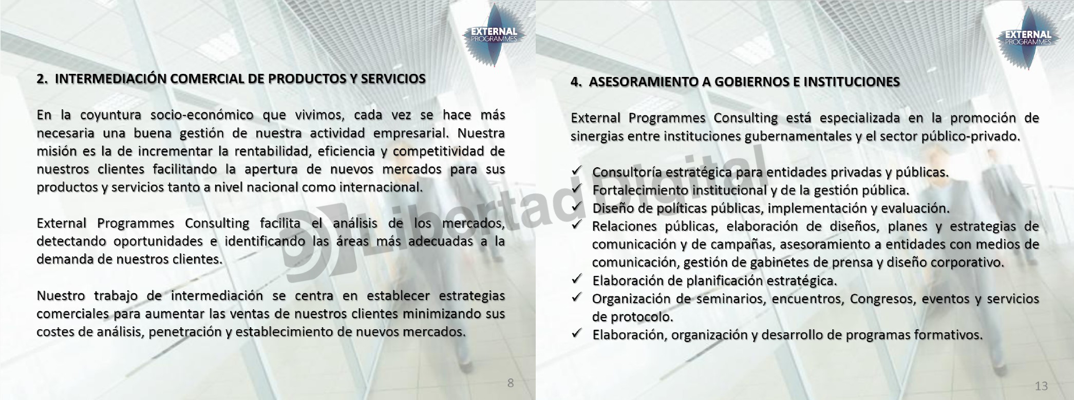 El dossier de la sociedad también recoge otro área de negocio de la mercantil, el asesoramiento a Gobiernos e Instituciones: "External Programmes Consulting está especializada en la promoción de sinergias entre instituciones gubernamentales y el sector público-privado. Consultoría estratégica para entidades privadas y públicas. Fortalecimiento institucional y de la gestión pública. Diseño de políticas públicas, implementación y evaluación. Relaciones públicas, elaboración de diseños, planes y estrategias de comunicación y de campañas, asesoramiento a entidades con medios de comunicación, gestión de gabinetes de prensa y diseño corporativo. Elaboración de planificación estratégica. Organización de-seminarios, encuentros, Congresos, eventos y servicios de protocolo. Y elaboración, organización y desarrollo de programas formativos".