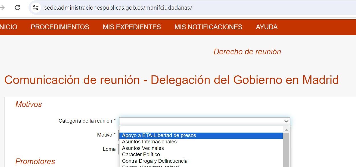 Así lo ha denunciado este martes la Asociación Víctimas del Terrorismo (AVT) y lo ha podido comprobar Libertad Digital haciendo los trámites iniciales para comunicar una concentración o comunicación a través del portal telemático de la Administración. En estos momentos, la opción "Apoyo a ETA-Libertad de presos" está disponible para pedir una convocatoria en la Delegación del Gobierno en Madrid.