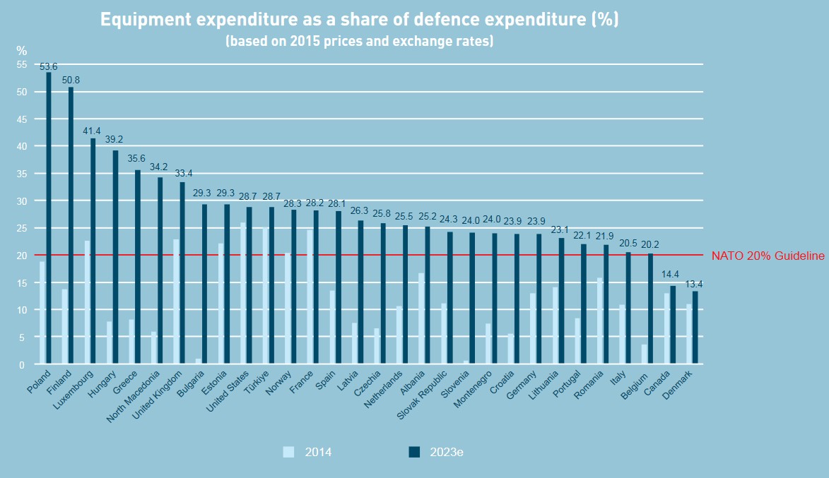 Pero el cumplimiento de este requisito es algo habitual desde hace años entre los socios, es decir, que es una excepción aquellos países que no lo cumplen. En el año 2023 no lo hicieron únicamente Canadá y Dinamarca. España es el decimoquinto país que más dedica a los nuevos programas de armamento, con el 28,1 por ciento de su inversión, muy lejos de los países que encabezan esta lista: Polonia (53,6 por ciento) y Finlandia (50,8 por ciento).