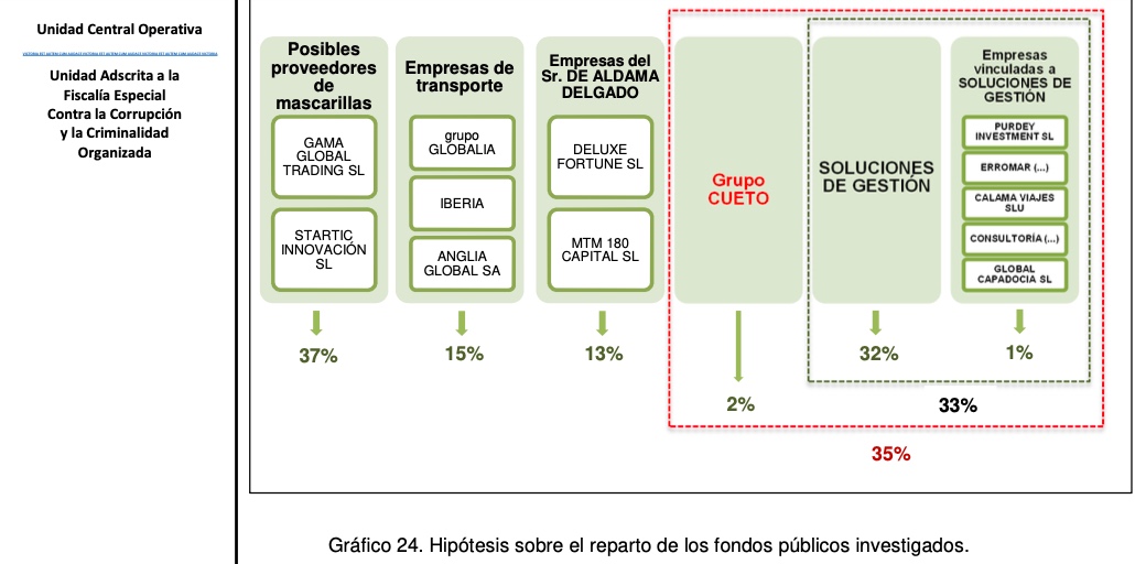 El informe de la UCO hace un desglose de las ganancias partiendo de que toda la red de venta de material sanitario generó unos ingresos de 54,53 millones de euros. Y en ese apartado se fija en las "empresas vinculadas a Victor Gonzalo de Aldama Delgado": Deluxe Fortune SL habría recibido un total de 3.338.023,04 euros. Y MTM 180 Capital SL habría recibido pagos por una cantidad total de 3.338.023,04 euros: Lo primero que llama la atención es la perfecta distribución a medias de la cuantía recibida de la trama cuando, por pura lógica, alguna debió hacer más que la otra si se de veras se hubiesen dedicado a trabajos efectivos y no a ser dos sociedades meramente instrumentales.