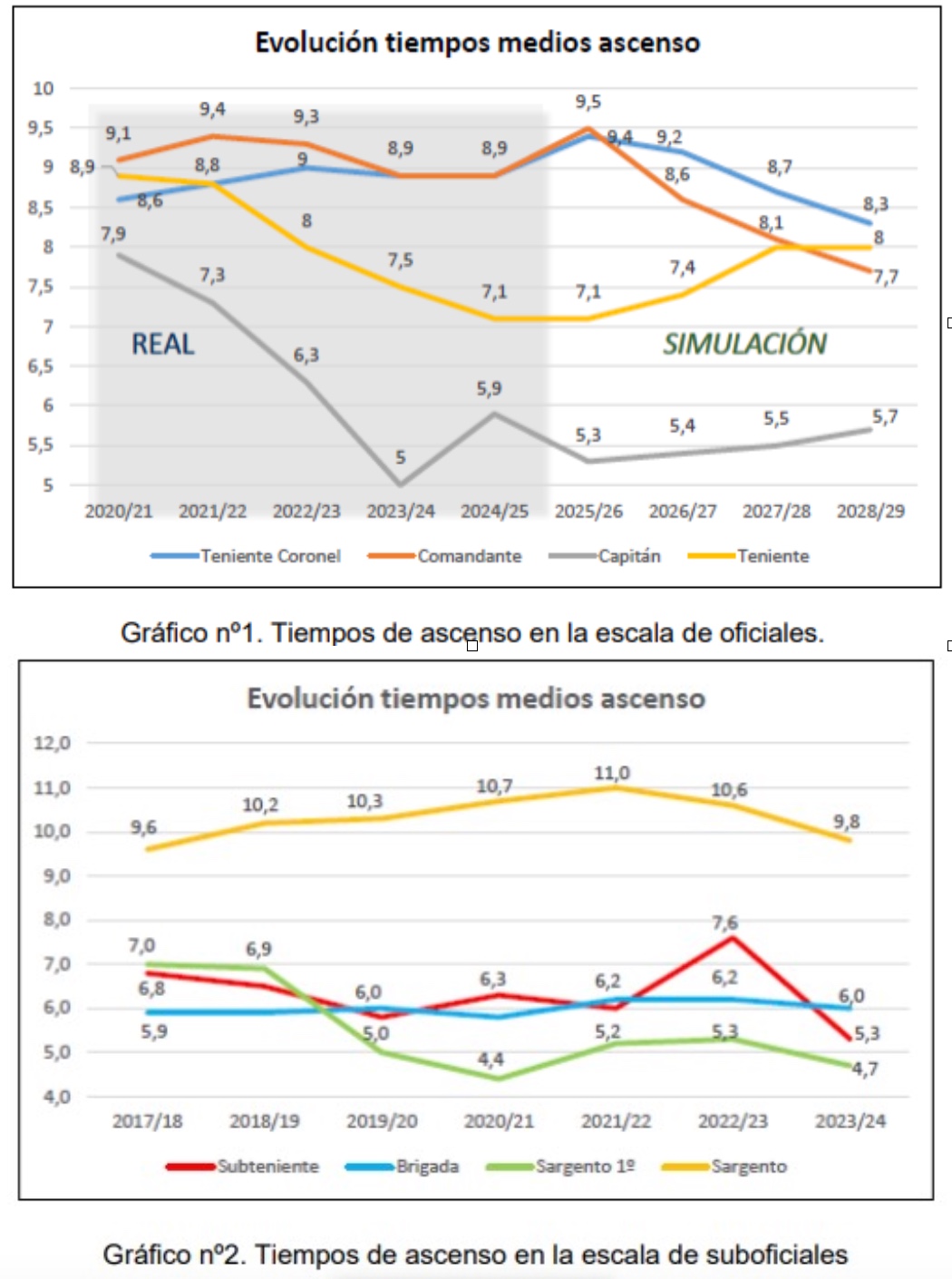 Desde JUCIL han hecho públicas también "dos gráficas, facilitadas por la Dirección General de la Guardia Civil, que contienen la evolución de los tiempos de ascenso, la primera corresponde a la escala de oficiales correspondiendo a la realidad entre el 2020 y 2025 y simulada, entre el año 2025 2029, y la segunda gráfica refleja los tiempos de ascenso en la escala de suboficiales".