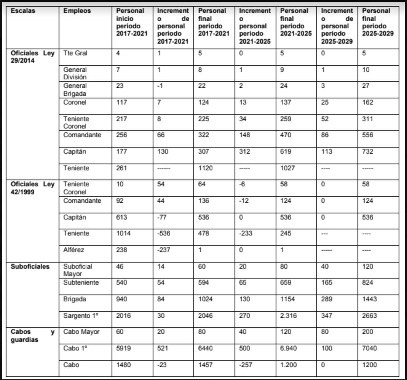 Las actas de JUCIL revelan que las reuniones mantenidas con la Dirección de la Guardia Civil han servido para alertar ya de este problema. "Con el ánimo de que se entiendan nuestras reivindicaciones exponemos la tabla con el incremento de personal de los periodos 2017-2021, 2021-2025 establecidos en los diferentes Reales Decretos que regulaban la plantilla y la proposición actual para el periodo 2025-2029", señalan desde la asociación. La tabla en cuestión es la que hoy reproduce Libertad Digital. Y, efectivamente, muestra el grave deterioro del cuerpo diseñado por el Gobierno.