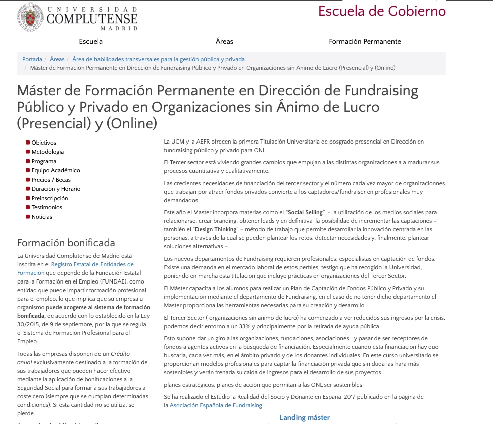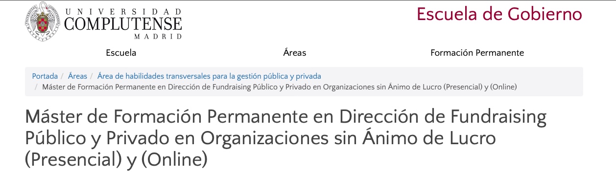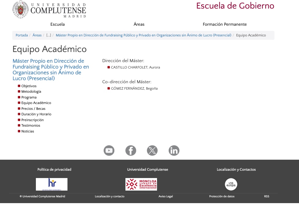 Así lo hizo Gómez, por ejemplo, en octubre de 2022, en una mesa redonda, bajo la moderación de Blanca de Juan, Coordinadora de la Cátedra de Transformación Social Competitiva (TSC) y del Máster en Dirección de Fundraising (recaudación de fondos). Es más, el propio máster ha llegado a ser promocionado como máster en "Dirección en Fundraising Público-Privado para ONL". Y con explicaciones como las siguientes: "El Máster capacita a los alumnos para realizar un Plan de Captación de Fondos Público y Privado y su implementación mediante el departamento de Fundraising, en el caso de no tener dicho departamento el Master proporciona las herramientas necesarias para su creación y desarrollo".