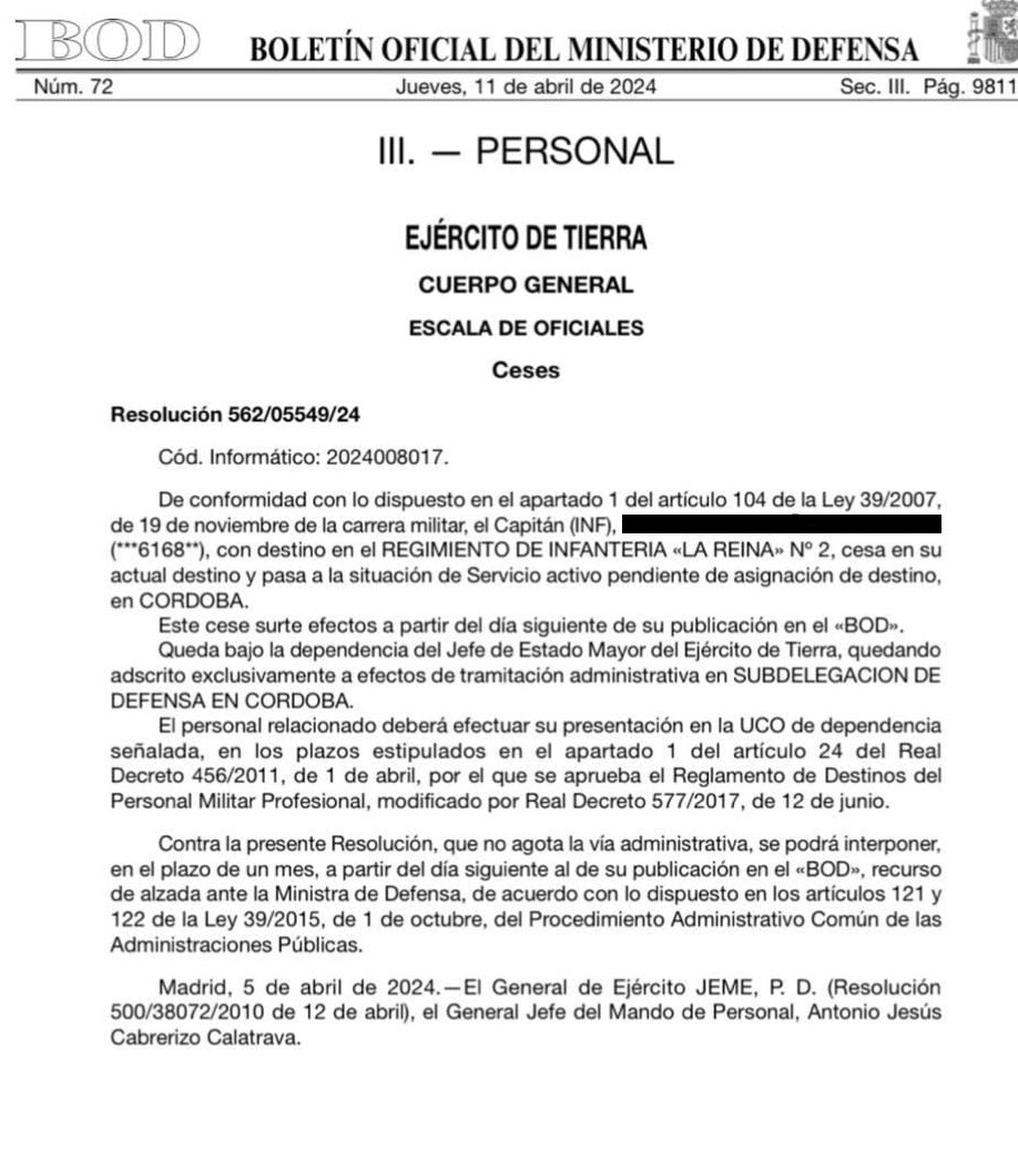 El texto de la resolución especifica que "este cese surte efectos a partir del día siguiente de su publicación en el BOD" –es decir, este viernes 12 de abril– y que el oficial debería ponerse a disposición desde ese día de la UCO (Unidades, Centros y Organismos) de la subdelegación en Córdoba. También recuerda que el capitán afectado puede recurrir la decisión mediante un recurso de alzada a la ministra de Defensa, Margarita Robles, en el plazo de un mes.