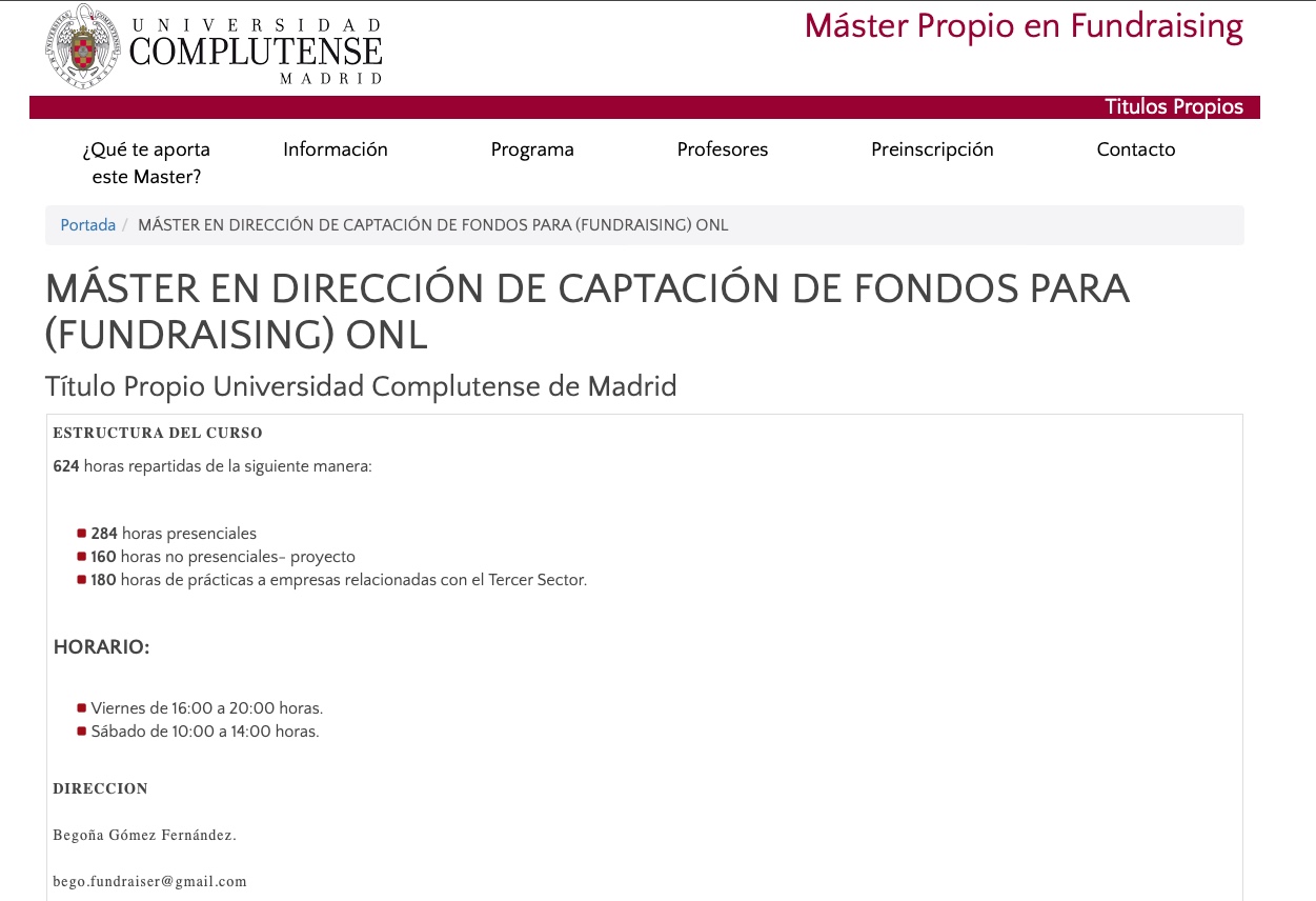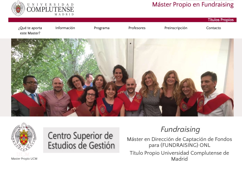 Pero algo ha debido llevar a pensar que era mejor no remarcar el término "público" porque, lo cierto, es que en la siguiente promoción se puede observar como esa referencia desaparece: "Máster en dirección de captación de fondos para (fundraising) ONL. Título Propio Universidad Complutense de Madrid".