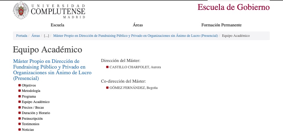 Otra de las inscripciones internas de aquella época confirmaba el subrayado de los fondos "públicos": "Máster Propio en Dirección de Fundraising Público y Privado en Organizaciones sin Animo de Lucro", señalaba en el mismo lugar de la web de la universidad en el que se destacaba la presencia de "Begoña Gómez Fernández. Codirectora del máster".