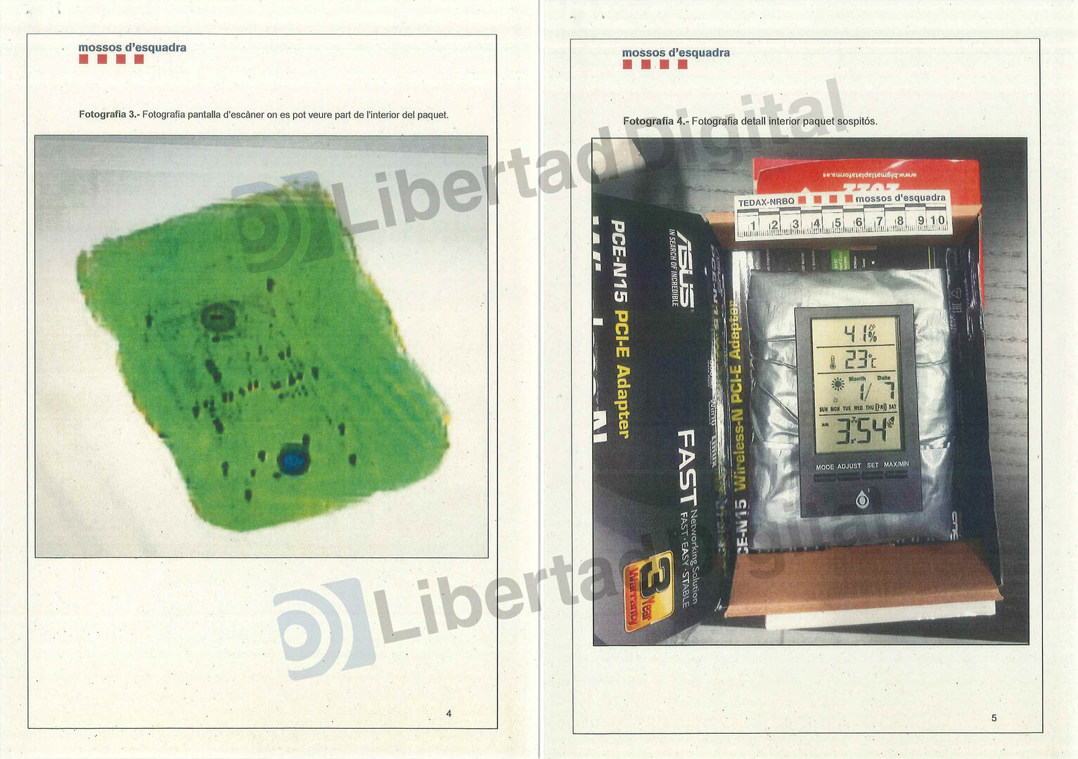 Libertad Digital publicó el informe fotográfico completo de los mossos que recoge las imágenes de la bomba simulada. Las fotografías muestran un paquete de cartón con dos sellos sin remitente y con la dirección del Juzgado escrita a mano con bolígrafo. En el interior de la caja había un paquete gris con una sustancia sin identificar envuelta en papel albal. Encima del paquete, se situaba un reloj digital y una placa base de un ordenador de la marca Asus.