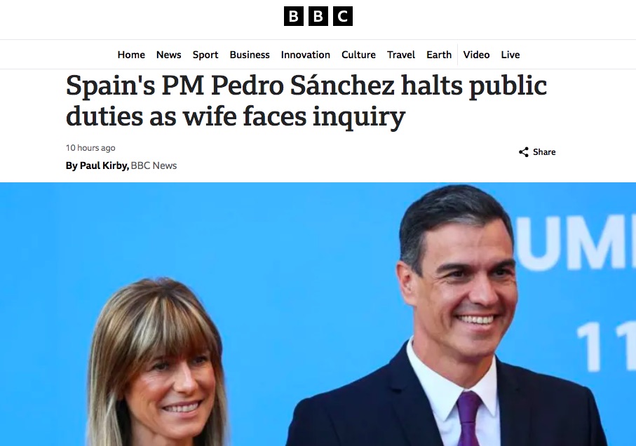 En Reino Unido, la BBC señala cómo Sánchez "decide parar sus deberes públicos mientras su mujer se enfrenta a una investigación" y en el interior, además de citar las diligencias abiertas, resume la pieza de El Confidencial sobre las pesquisas profundizando en los motivos y citando los acuerdos de Globalia con el Africa Center así como el rescate de Air Europa en la pandemia. Alude también al semblante "disgustado" que exhibió el presidente tras la sesión de control en que aludió al asunto.