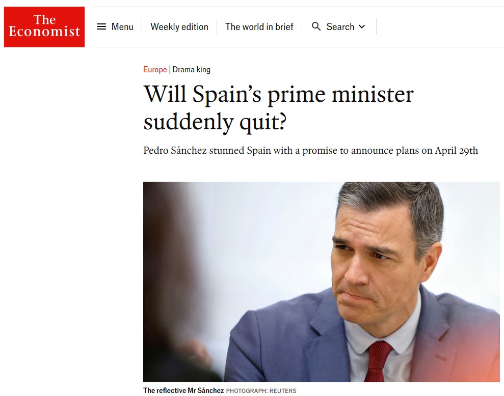 De entre ellos destaca el retrato que hace el británico The Economist: "Pedro Sánchez sabe de dramas", arranca el artículo que llega a apodar al presidente "Drama king" (rey del drama). Tras recordar que su convocatoria electoral "en su momento más débil parecía una locura", dice que "el drama ha vuelto con su sorprendente decisión de despejarse la agenda hasta el lunes".