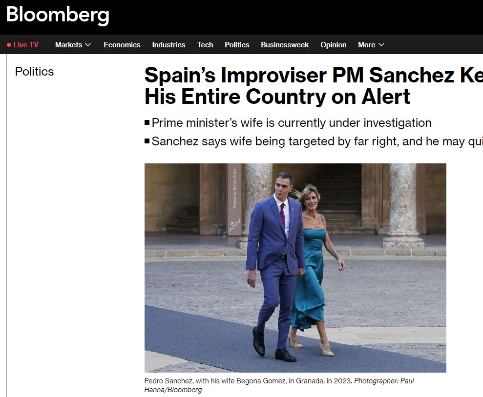 El artículo hace un prolijo resumen de los negocios y sospechas sobre Begoña Gómez, desde sus cartas de apoyo a Barrabés al rescate de Air Europa, concluyendo que los "pilares del caso son endebles, por el momento", lo que le lleva a preguntarse el por qué del anuncio. Entre las posibles teorías, cita su intención de hacerse con "un trabajo internacional, el más plausible el de la presidencia del Consejo Europeo", reservado, apunta, "para un político veterano de centro izquierda". Pero a continuación entierra las posibilidades de Sánchez, que pese a representar a un país "potente", lideró una "presidencia europea decepcionante" y también ha puesto en aprietos a Bruselas con sus "inusualmente duras críticas a Israel".