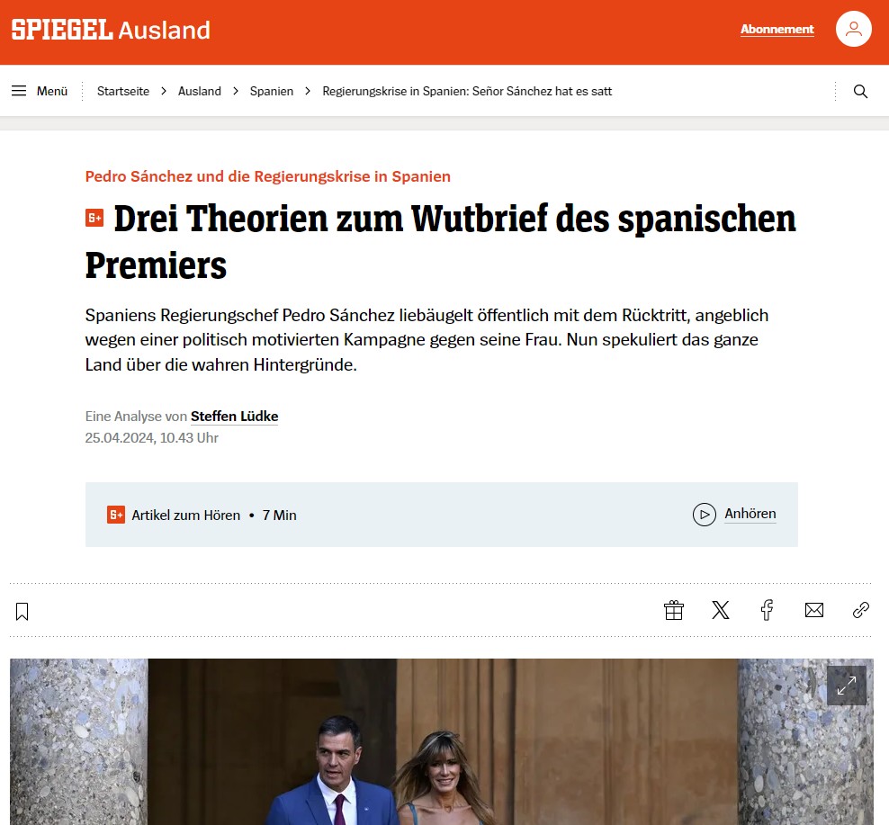 De entre las informaciones publicadas estos días también cabe resaltar las "tres teorías" que plantea Der Spiegel sobre el futuro de Sánchez tras su "airada carta". La primera que plantea es que realmente Sánchez esté "destrozado" por las críticas a su esposa y se trate de un movimiento emocional, "sin un plan maestro detrás". Recuerda al respecto el "estilo muy personal" de la misiva.