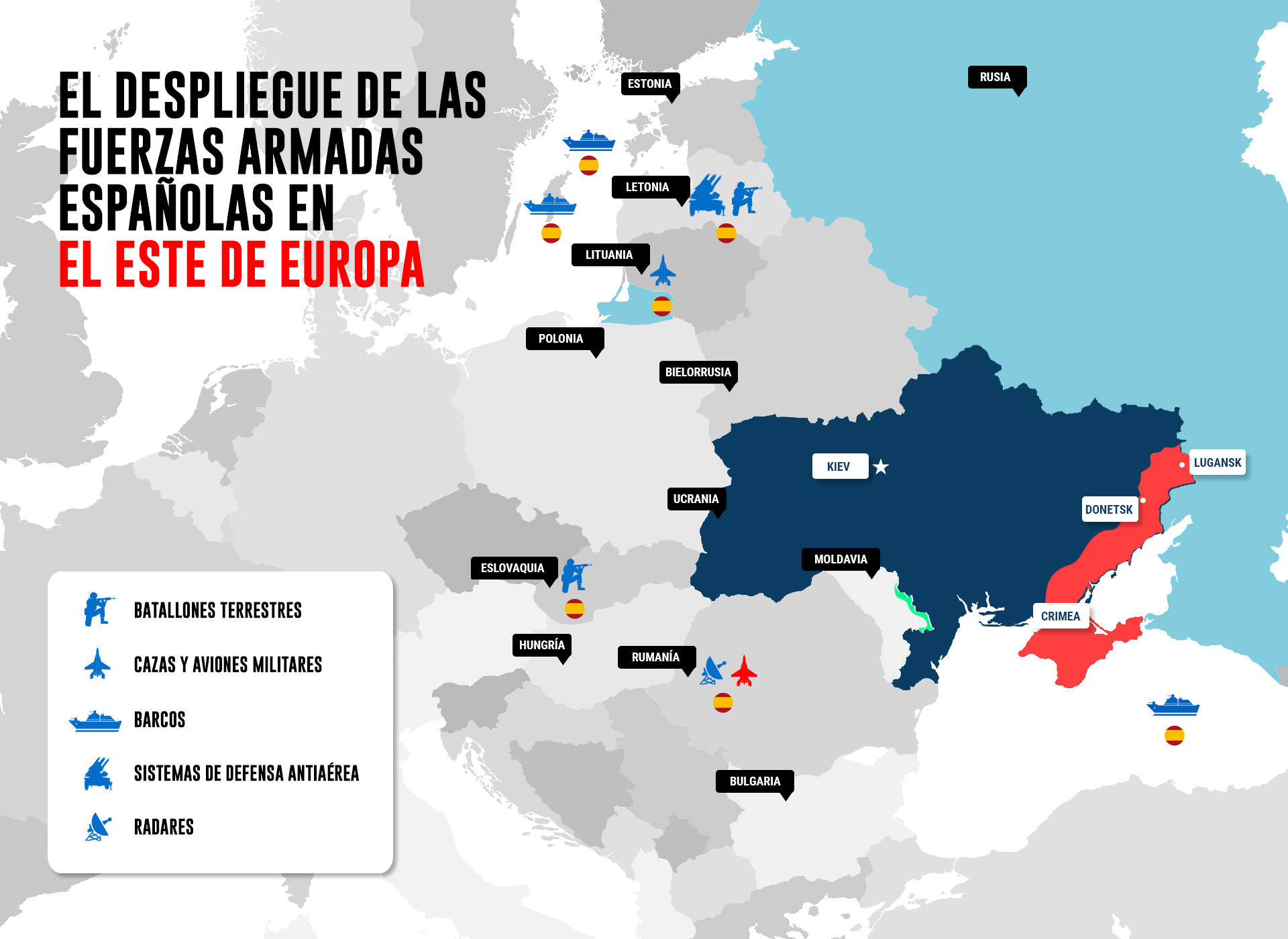 El despliegue de las Fuerzas Armadas españolas en el Este de Europa, en el denominado muro anti-Rusia de la OTAN, ha ido aumentando de forma exponencial en los últimos años. El primer incremento se produjo tras la invasión rusa de Crimea y el apoyo a los levantamientos armados en el Donbás ucraniano en 2014. El segundo aumento ha llegado con la segunda invasión rusa a Ucrania que se inició en febrero de 2022.
