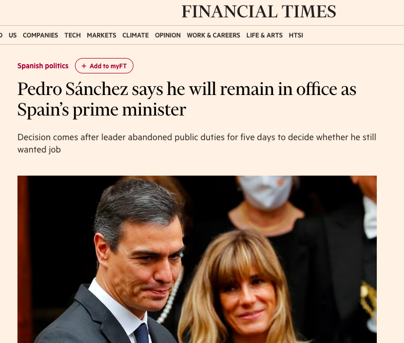 El presidente abre los principales medios internacionales, desde la BBC al Corriere della Sera, con fotos en muchos casos de Sánchez con su mujer: como ocurrió tras su incalificable carta del pasado miércoles, el grueso de las informaciones aportan datos sobre las sospechas sobre su esposa, desde los contratos de Barrabés al rescate de Air Europa con la conclusión de sus reflexiones: sigue en Moncloa.